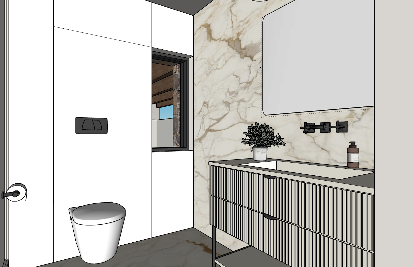 make a render for this bathroom the counter top is white corian and the cupboard light oak wood