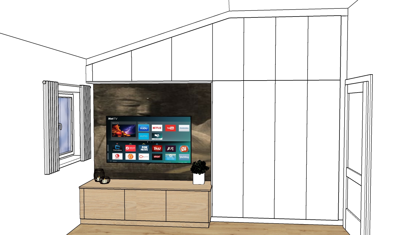 die wei en schr nke in wei und die unterschr nke unter dem tv in holz die r ckwand hinter dem tv als tapete lt farbe