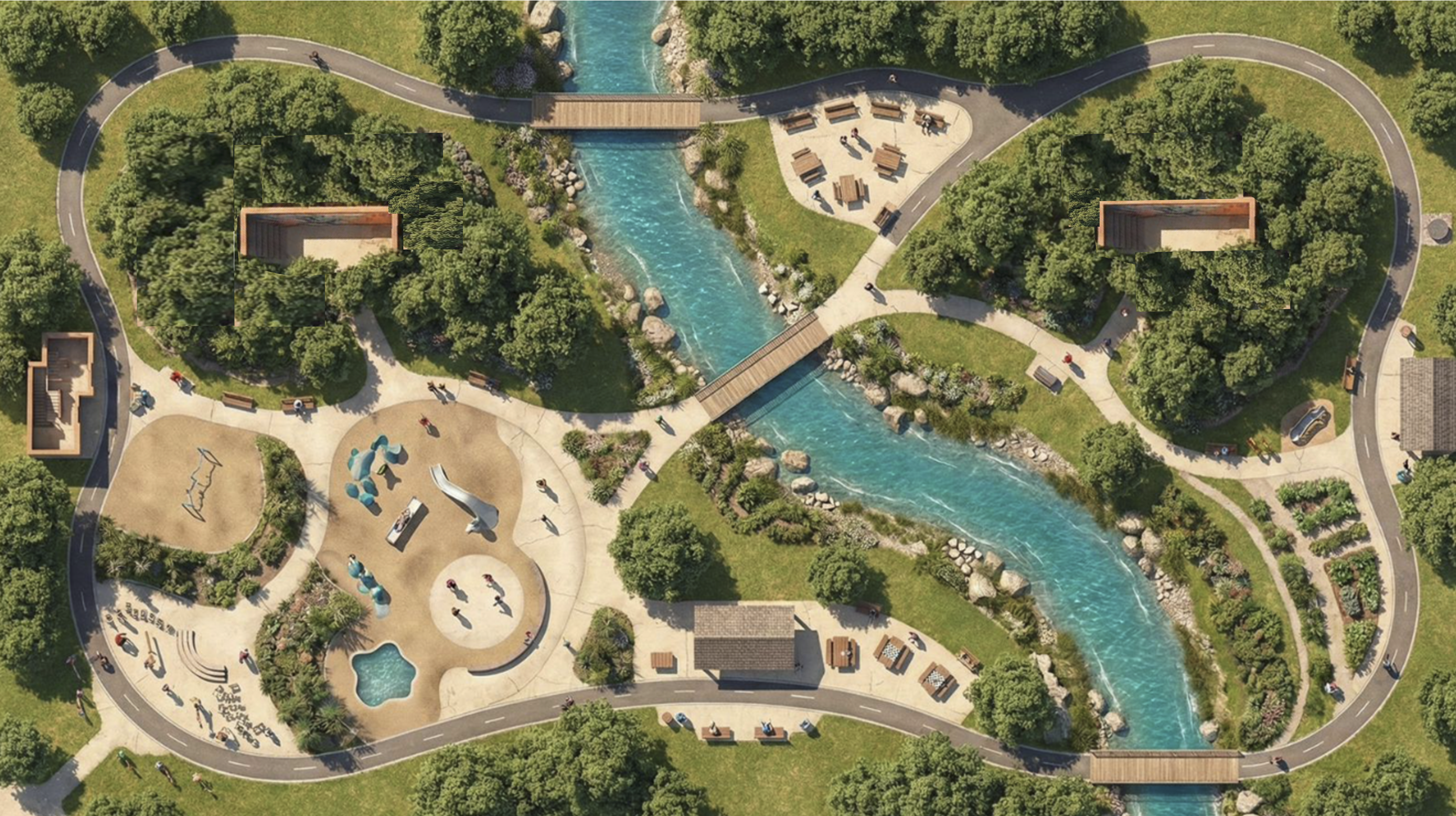 enhance the attached image to true 4k resolution increasing clarity sharpness and detail without altering the visual content all elements architecture landscape textures shadows colors and people must remain exactly the same in design and geometry the goal is not to change the image but to make every existing detail more crisp defined and photorealistic upscaling requirements upscale to 3840 2160 4k resolution preserve the original color palette tone shadows gradients and highlights do not modify the composition proportions perspective or structure do not remove or add objects unless necessary to correct upscaling artifacts keep all lighting direction and intensity identical do not artificially brighten or stylize this is a purity enhancement pass only quality enhancement instructions apply even enhancement across the entire image so no area looks sharper or softer than another sharpen fine edges tree lines bricks vegetation detail rock texture pathways clarify subtle textures water ripples foliage grain soil variation architectural materials enhance micro shadows contact shadows soft ambient occlusion edges of natural forms refine human silhouettes while maintaining their original appearance and scale increase overall crispness without over smoothing or introducing noise strict preservation rules do not shift colors alter shadows change brightness or contrast beyond natural sharpness improvements warp or stretch geometry add new reflections textures or lighting styles remove grain or depth cues that belong to the original rendering the enhanced image should feel like the same image but rendered originally at 4k with high end photographic clarity