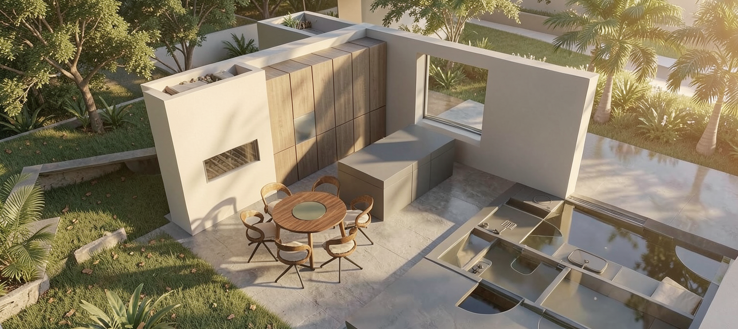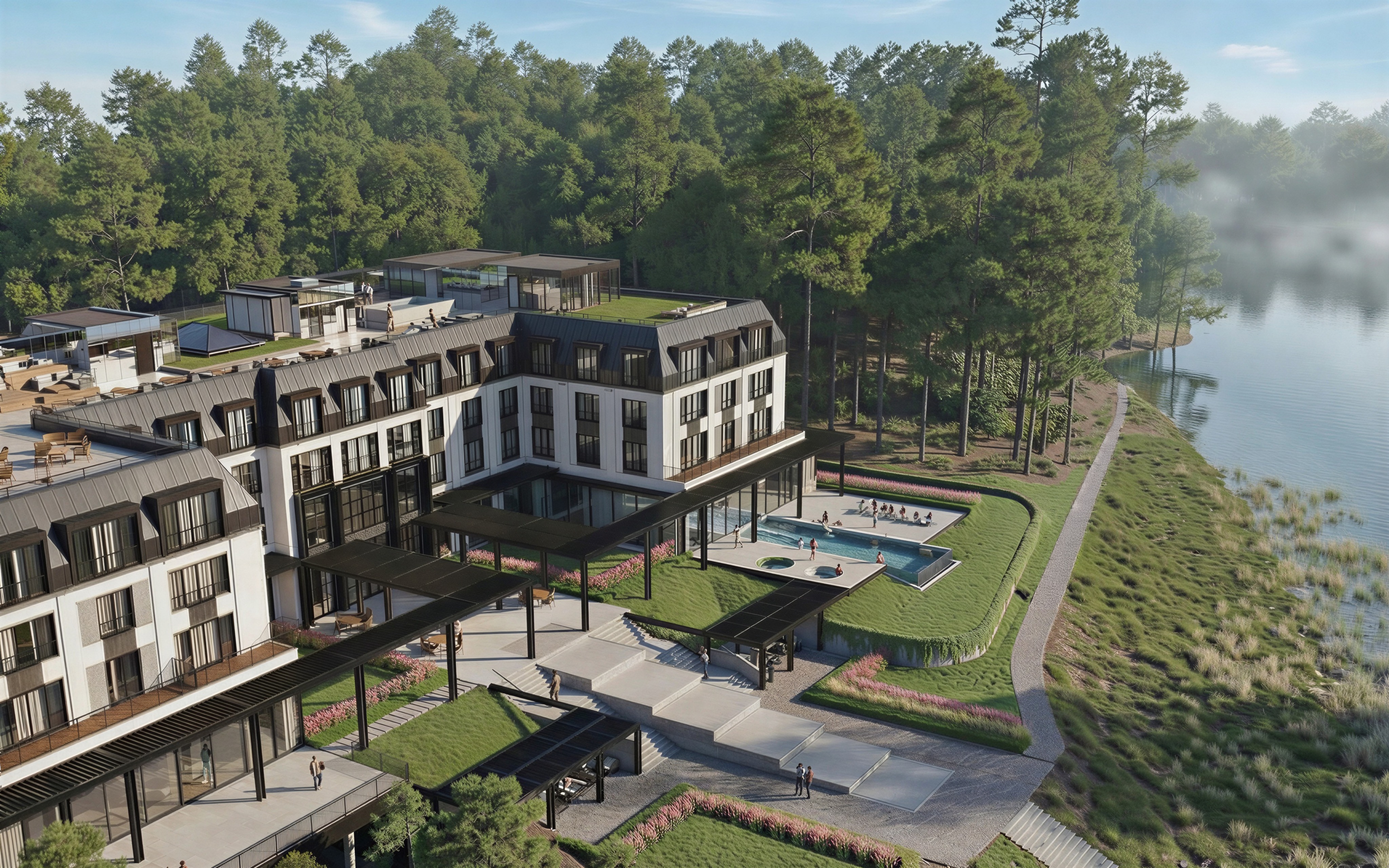 transform this image into a hyper photorealistic architectural visualization replace all non realistic materials with lifelike versions maintaining the dominant color palette add natural subtle sheen and glossy highlights on metals glass wood surfaces create realistic textures on concrete plaster and fabrics with micro details change background to serene lake region surrounded by dense forest enhance surrounding environment to ultra realistic quality while preserving exact structure and shape of bushes trees grass and lake detailed bark textures with moss on trees natural leafy density variation on shrubs short grass blades mixed with soil patches reflective lake surface with gentle ripples realistic water depth and shoreline details preserve natural forest floor under trees as woodland litter and earth leaf litter pine needles moss patches soft brown soil texture blending seamlessly add precise environmental reflections in every glass pane capturing surroundings bright high key lighting throughout with even daylight illumination no harsh shadows clear blue sky with soft clouds ultra detailed 8k photorealistic render professional architectural photography style