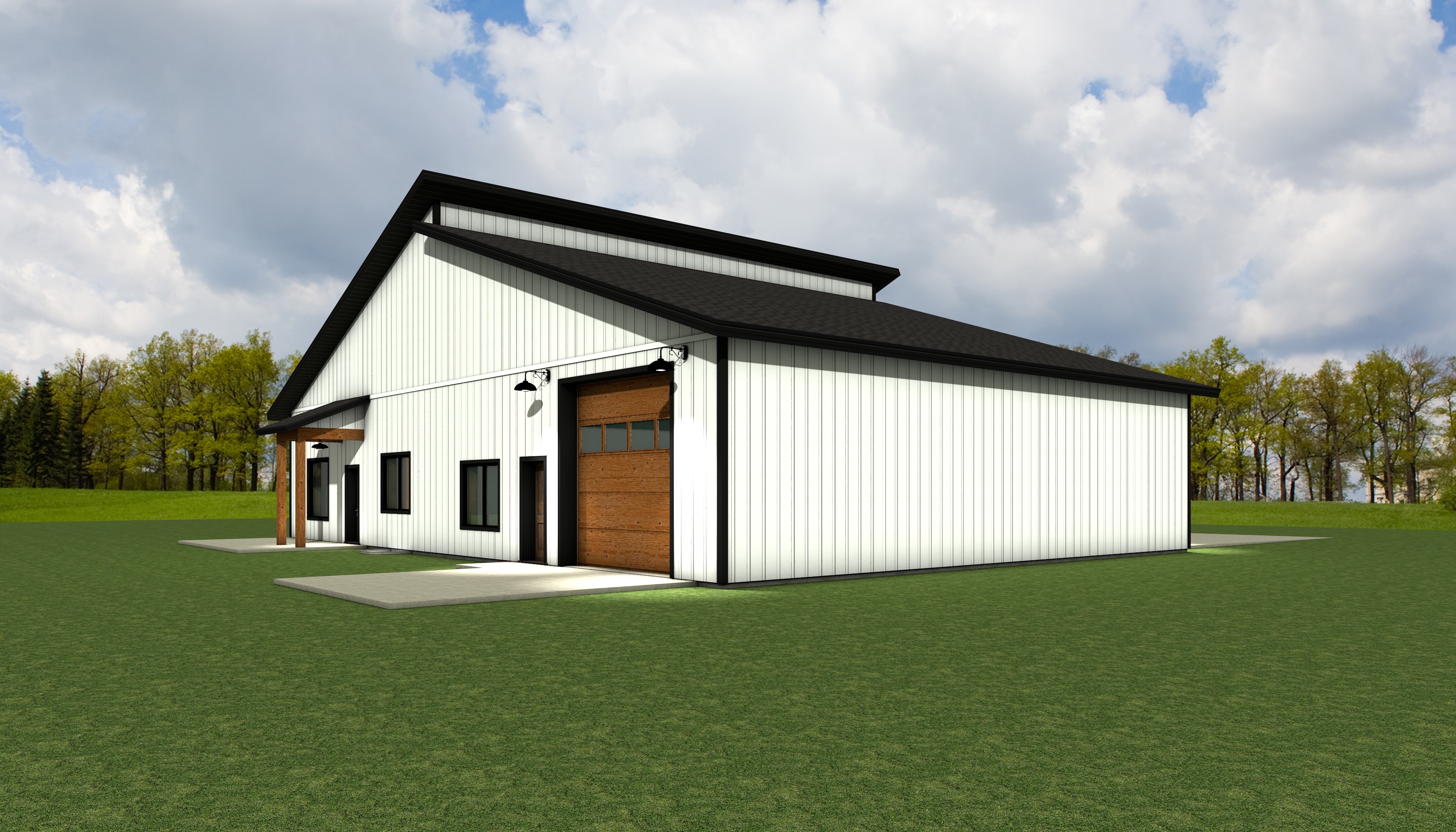 a photo realistic image of a modern house retain the exact structure colors and window arrangement rooflines shiny new metal siding foundation height railings wood stain colors and proportions exactly as shown in the reference image integrate into the terrain there are very few trees of mixed hardwoods that are mostly on in the distance of the image add warm diffused afternoon sunlight subtle dappled highlights across the siding and grass create ultra realistic lighting crisp shadows detailed textures in the siding and glass reflections and an overcast sky show only a few lights visible inside render in hyper photo realistic architectural visualization quality 8k resolution make it the fall season add realistic landscape add a large pasture behind the structure with white 3 rail farm fence the grass around the structure is mowed add some small landscape bushes and plants around the porch