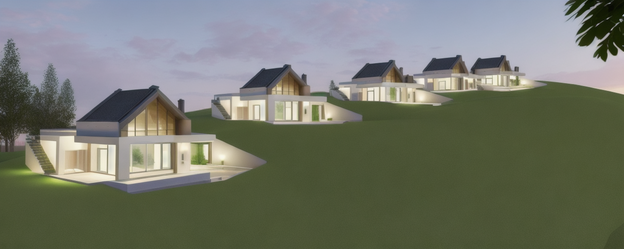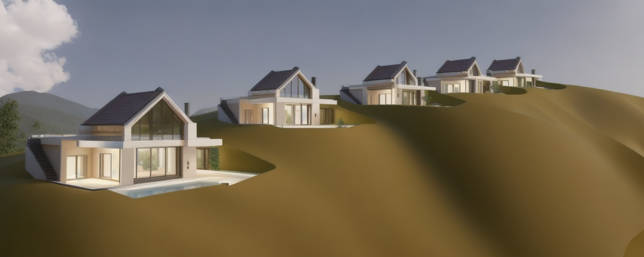 exterior shot these are some villas designed in a mountainous terrain the villas have red brick facades and the roof is made of sheet metal put some greenery the greenery and trees should look more real and the render should not look dry the render should not be warm colors but the ambient light should be brighter and be realized during the day the render should not look like a drawing but realistic don t change the villas to be as they were designed the facade should be made of red bricks don t change the villas just the environment put a tree in the environment so it doesn t look empty don t change the terrain put real green grass and add some trees to the environment architecture
