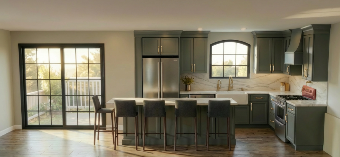 keep everything exactly the same in the rendering do not change the layout cabinet color walls floor lighting appliances or window only remove the part of the oven that goes on to the backsplash it is highlighted in red remove it and replace with the same existing backsplash marble do not change anything else and do not add anything make the final image look like a realistic photo rendering with natural lighting and soft shadows