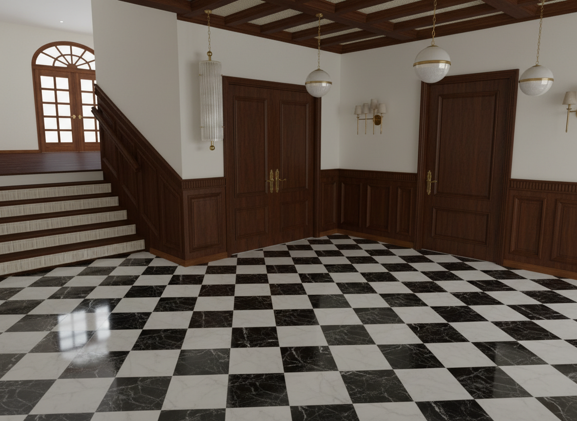 replace the existing wall sconces with a modern geometric wall sconce similar to the reference a rectangular slim fixture with angled top and bottom edges that create a triangular light distribution both upward and downward the fixture should have a dark metal finish matte black or bronze and emit warm light creating soft diffused triangular beams on the wall maintain the same placement and alignment as the current sconces do not modify any other elements in the scene