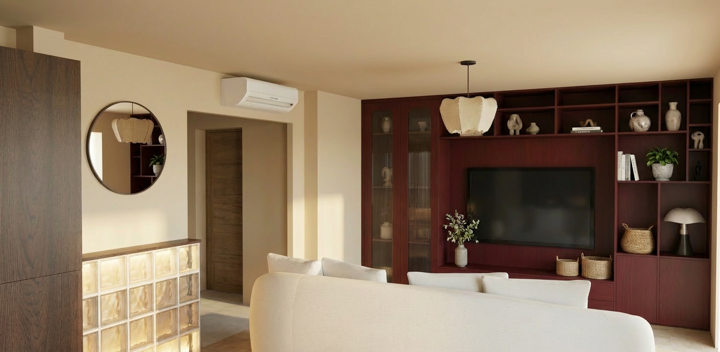 please make a realistic render with warm modern tones and black window frames set in a residential neighborhood with some large mature trees in the background keep existing material showing natural brick and board and batten siding dark slate roof and contemporary accents show a path leading to the front steps show some nice landscaping and a street to the far right below the property with a concrete retaining wall in between