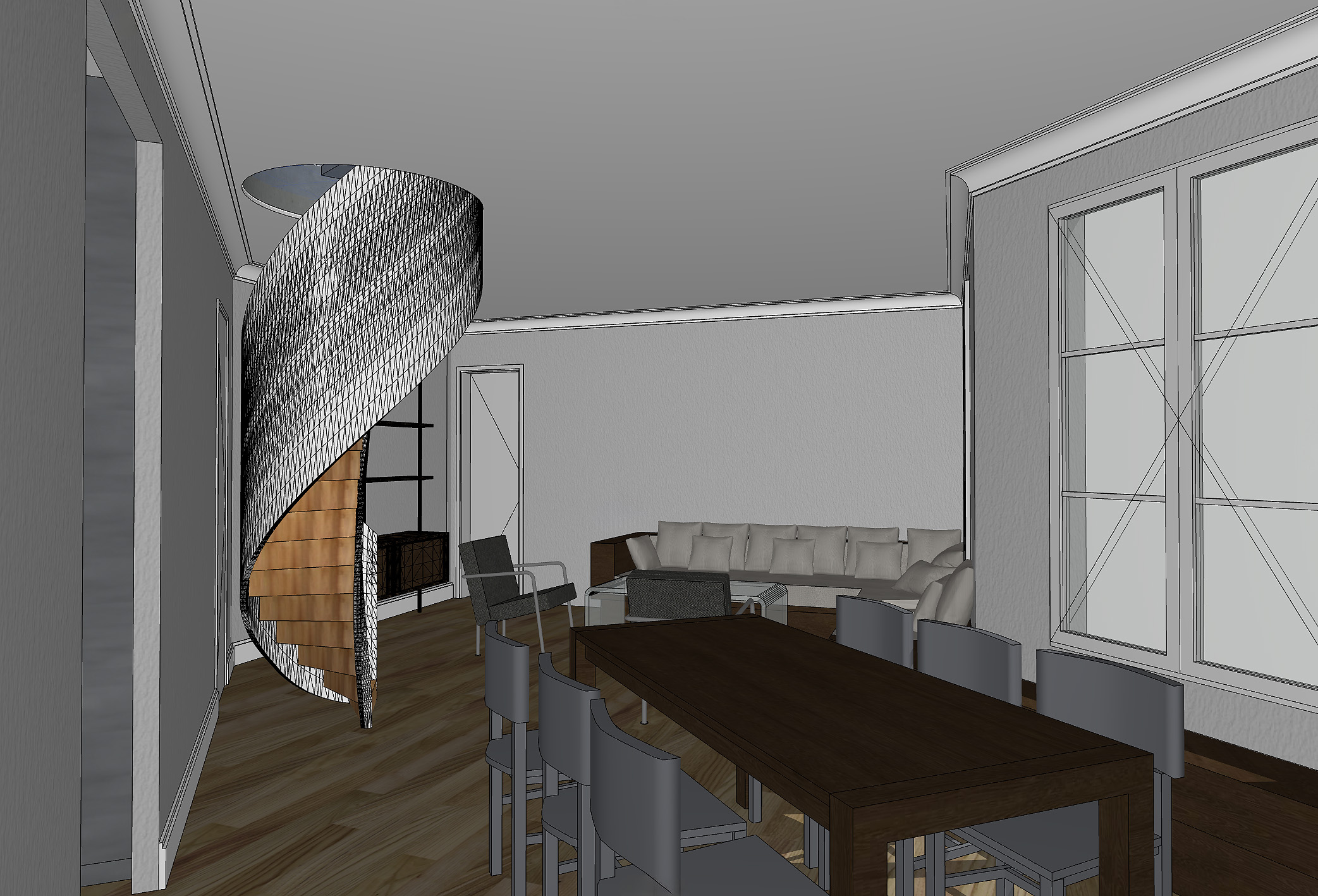 can you please reproduce this image exactly without changing the structure proportions or perspective but only making the following changes 1 the baseboards cornices and ceiling are painted white 2 the walls are painted light gray 3 the parquet flooring is dark oak herringbone 4 remove the cross lines on the white painted window and insert a blurred view of a courtyard in paris 5 there is a black metal curtain rod above the window and long open curtains in light gray linen 6 the dining room table is made of aged brown wood and the dining room chairs are made of chrome metal 7 remove all the small black lines on the stair railing which is painted light gray 8 the steps are made of very dark gray metal and there are no risers it is open 9 remove the cross marks on the door at the back which is painted white 10 the fabric of the bench seat visible at the back is gray and white boucl wool 11 give the image a photorealistic effect professional architectural rendering