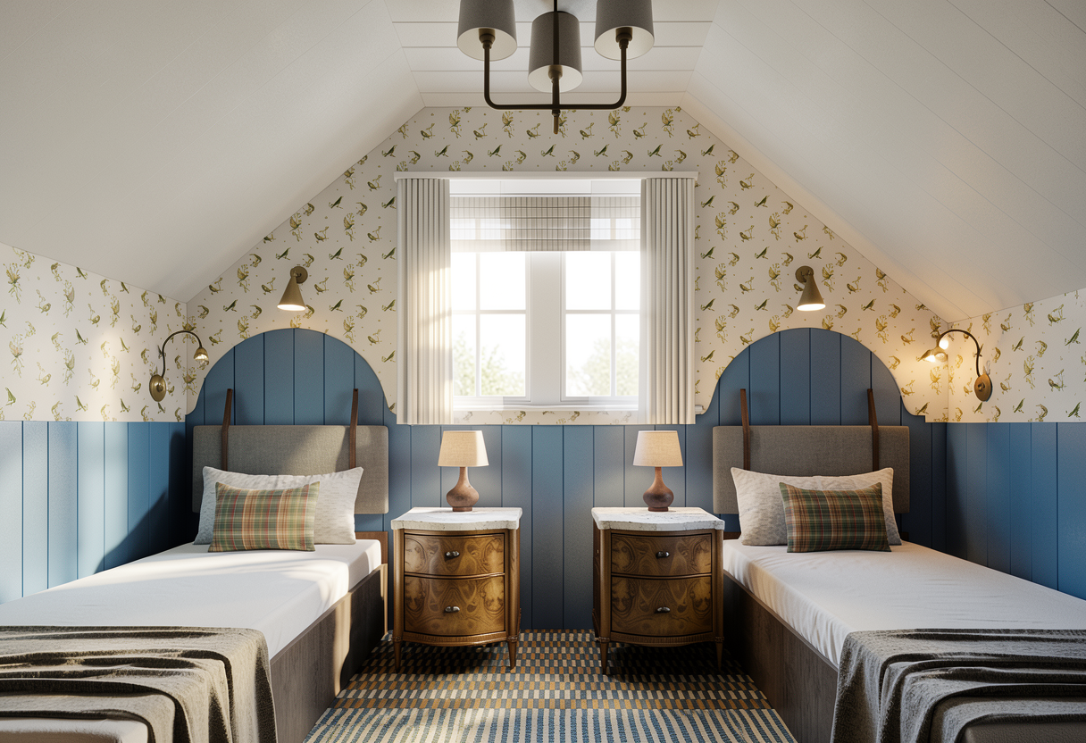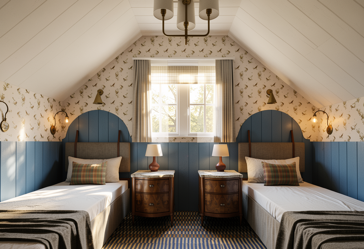 transform the white 3d hotel lobby render into a contemporary elegant interior without adding any furniture lighting fixtures artwork decorations or movable objects of any kind main color ral 8016 deep reddish brown accent color ral 1000 soft beige materials wooden veneer applied in a strictly minimal flat and geometric panel language with no trimmings no moldings no frames no reveals no decorative articulation veneer surfaces are planar and continuous defined only by subtle panel joints veneer has a glossy richly textured surface with visible depth of grain reminiscent of high quality mid 20th century wood paneling but expressed in a restrained contemporary manner the wooden veneer is limited to the lower portion of walls and architectural elements only the upper half of walls and ceilings is painted in ral 8016 creating a dark enveloping atmosphere heavy plain suede like carpet in ral 8016 staircase area the staircase is the conceptual focal point and is fully clad in metal including the stair itself the steps and all walls the staircase is attached to from floor to ceiling the metal treatment is continuous and monolithic creating a sculptural contrast against the painted and veneered surfaces architecture preserve the original architectural geometry proportions and spatial configuration exactly as provided do not alter the staircase geometry axis or surrounding volumes atmosphere dark restrained and cinematic driven purely by material contrast surface texture and light interaction on finishes rather than added elements composition wide angle view emphasizing the staircase as the primary focal point through material contrast and spatial hierarchy render style photorealistic richly textured immersive high contrast architectural visualization calm precise and materially expressive