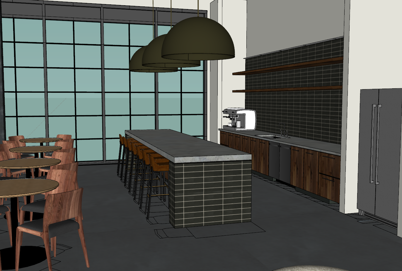 contemporary and industrial office break and coffee area add accessories and people in cool clothes both men and women with motion blur ceiling should be wood slats