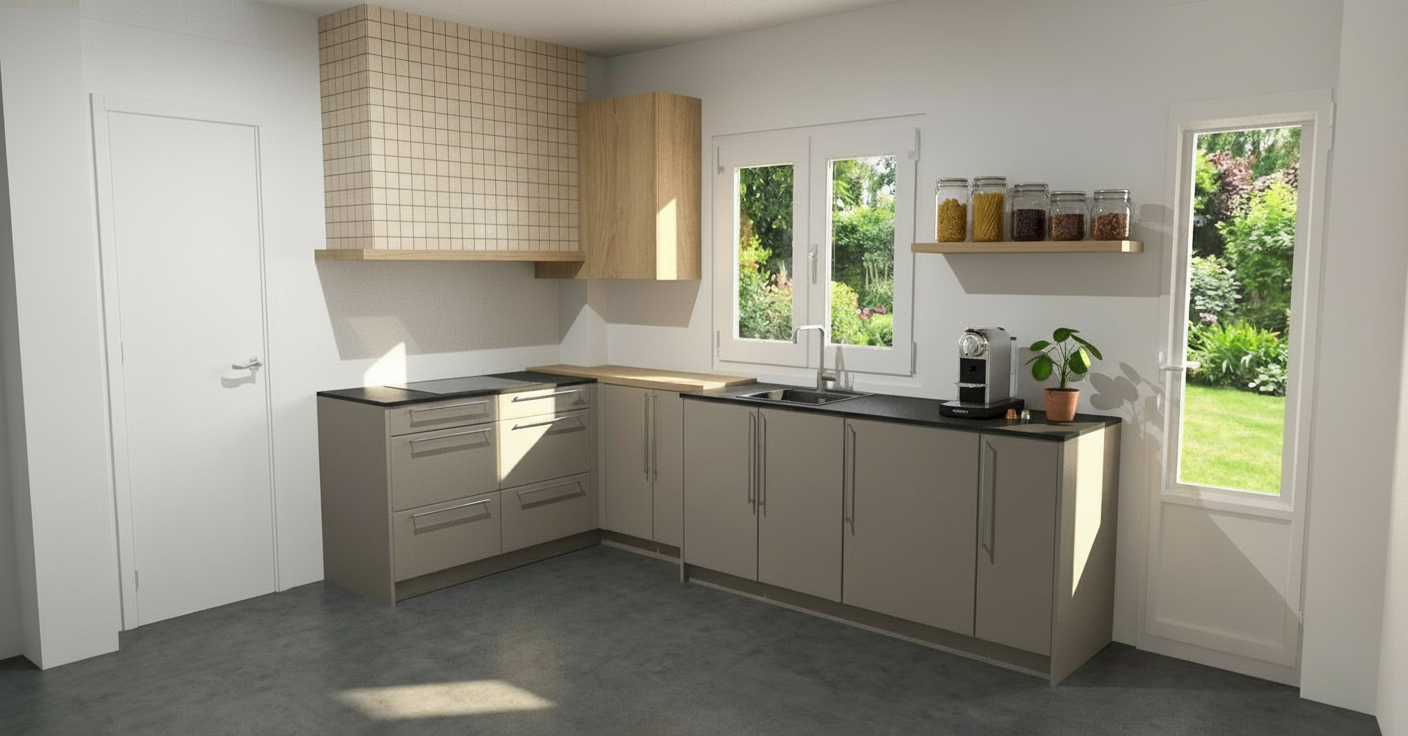 elimina la cafetera mant n la altura de la campana como el mueble de madera de al lado