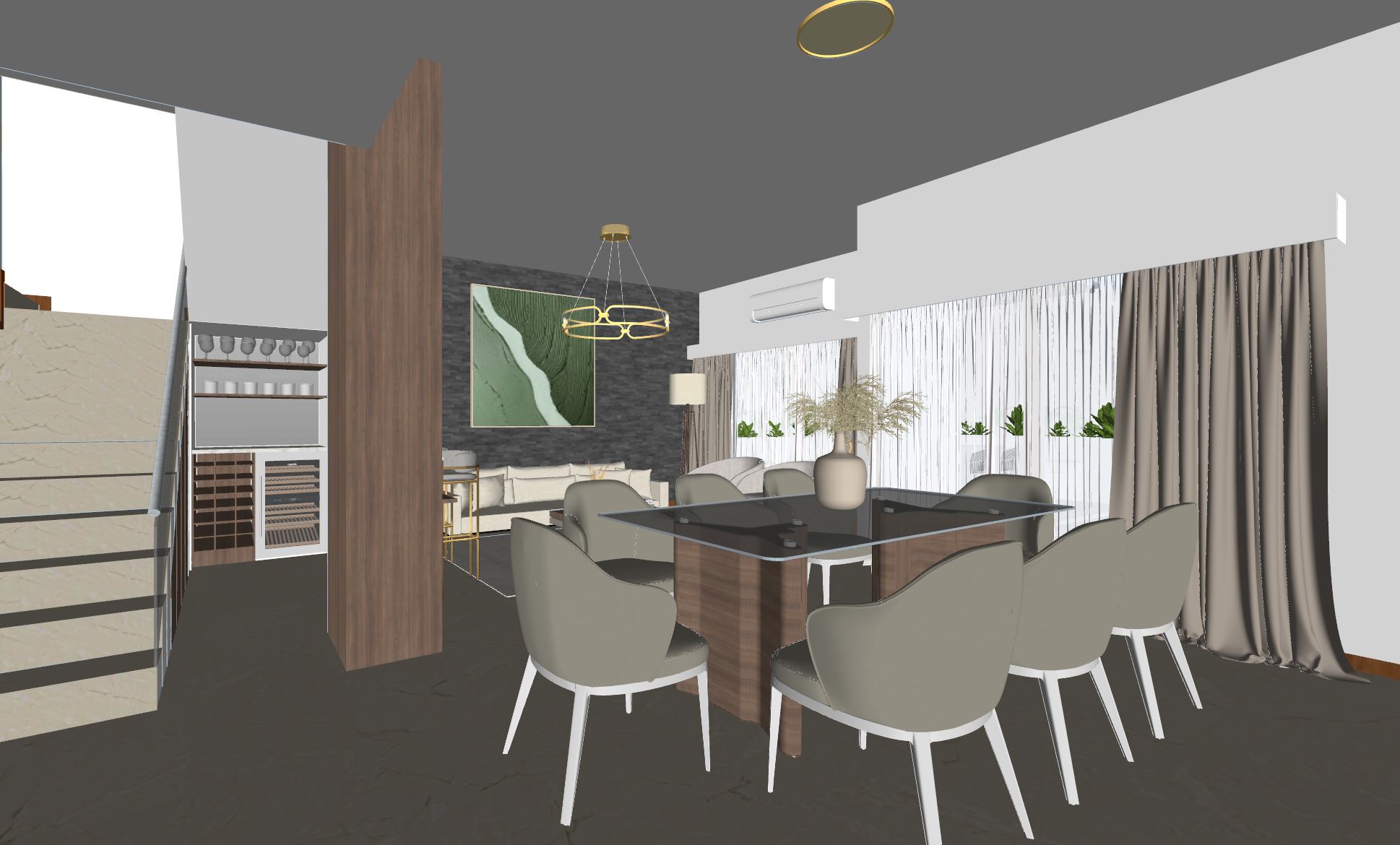 estoy trabajando con un screenshot del modelo 3d ayudame a generar una imagen ultrarealista del comedor con vista a la sala de una casa habitacion del lado izquierdo tenemos el bar debajo de la escalera el muro de al fondo es una piedra laja negra el piso en formato 60x60 tipo cemento claro respeta el dise o del mobiliario y la proporcion de la imagen