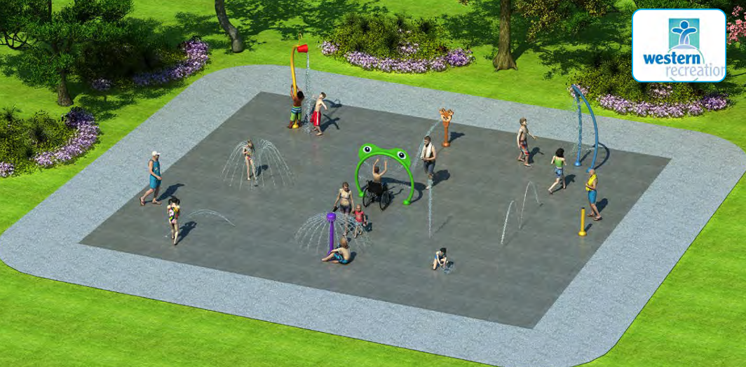 create a realistic rendering of the splash pad design surrounded by trees with a chain link fence around perimeter