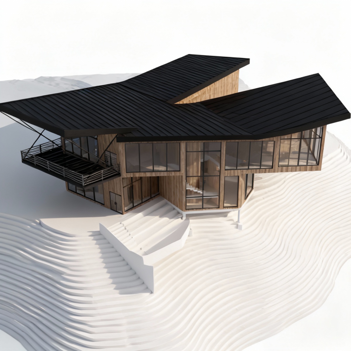 render the building in this image with soft textures the roof is a black the walls are dark wood paneling stone pavement with plants and trees in the planters