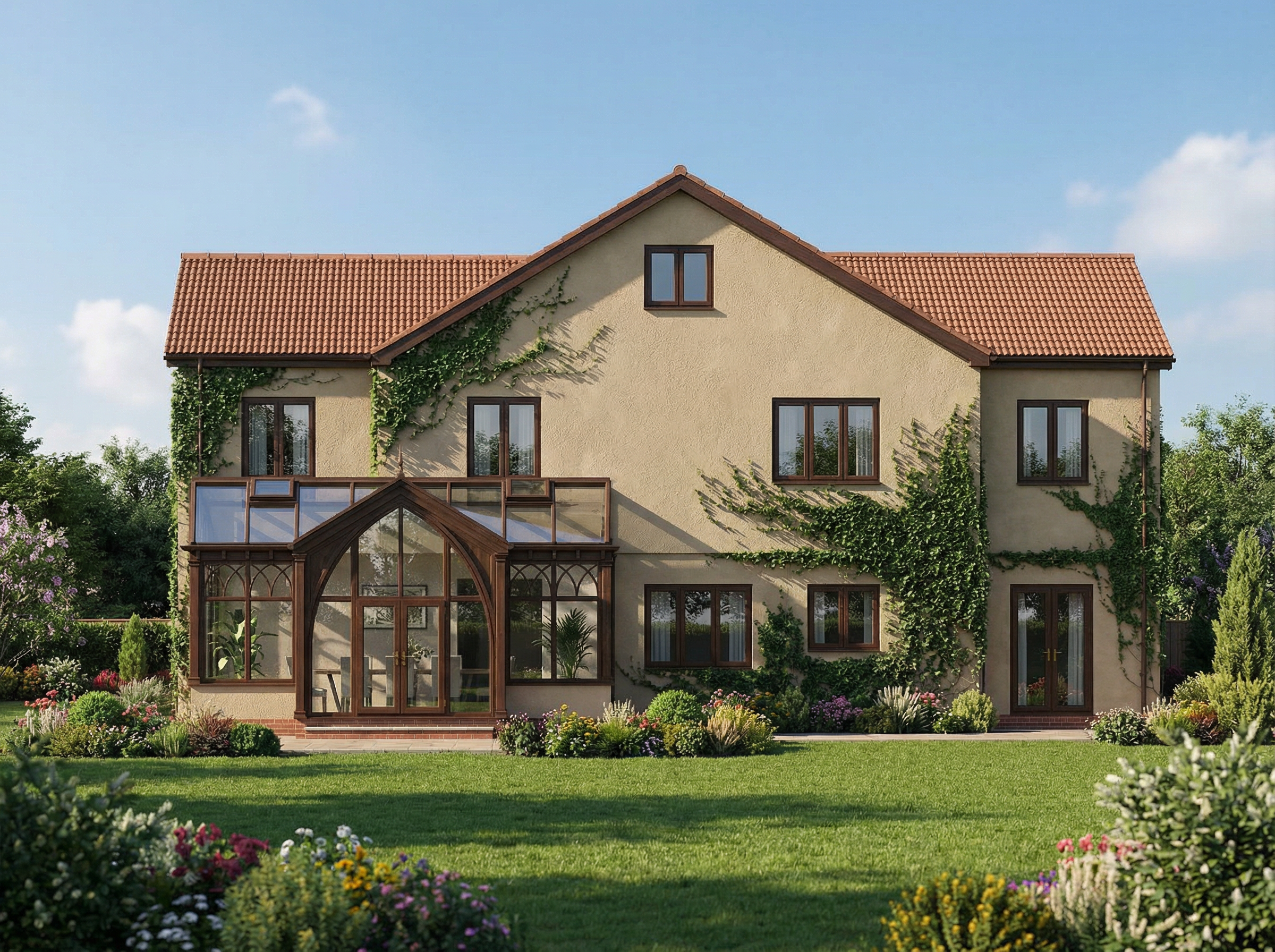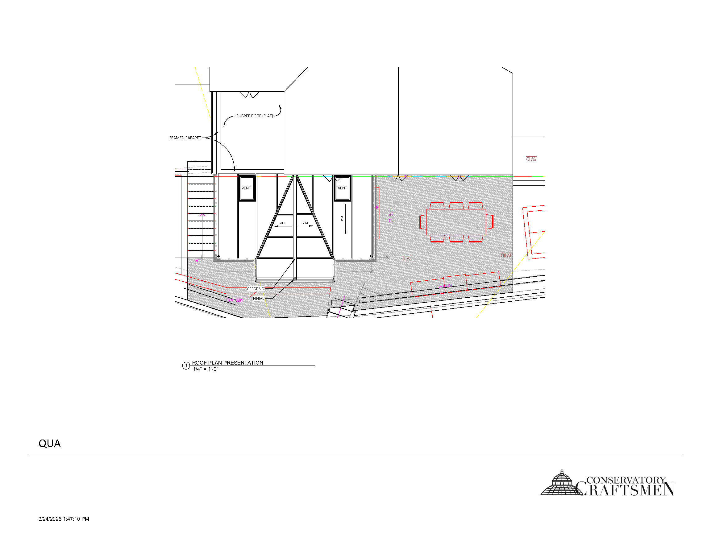 rendered roof plan with attached conservatory dining room surrounded by a backyard paver patio