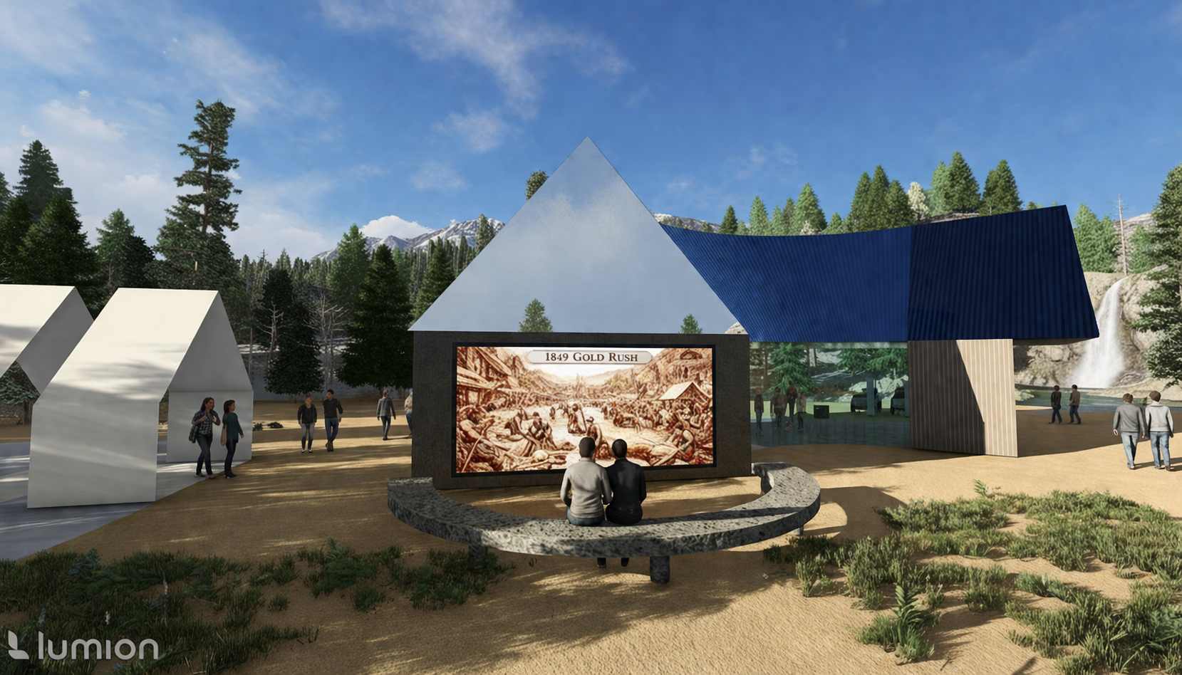 make the white pavilion on far left mirrored with people walking through it and make it a restroom