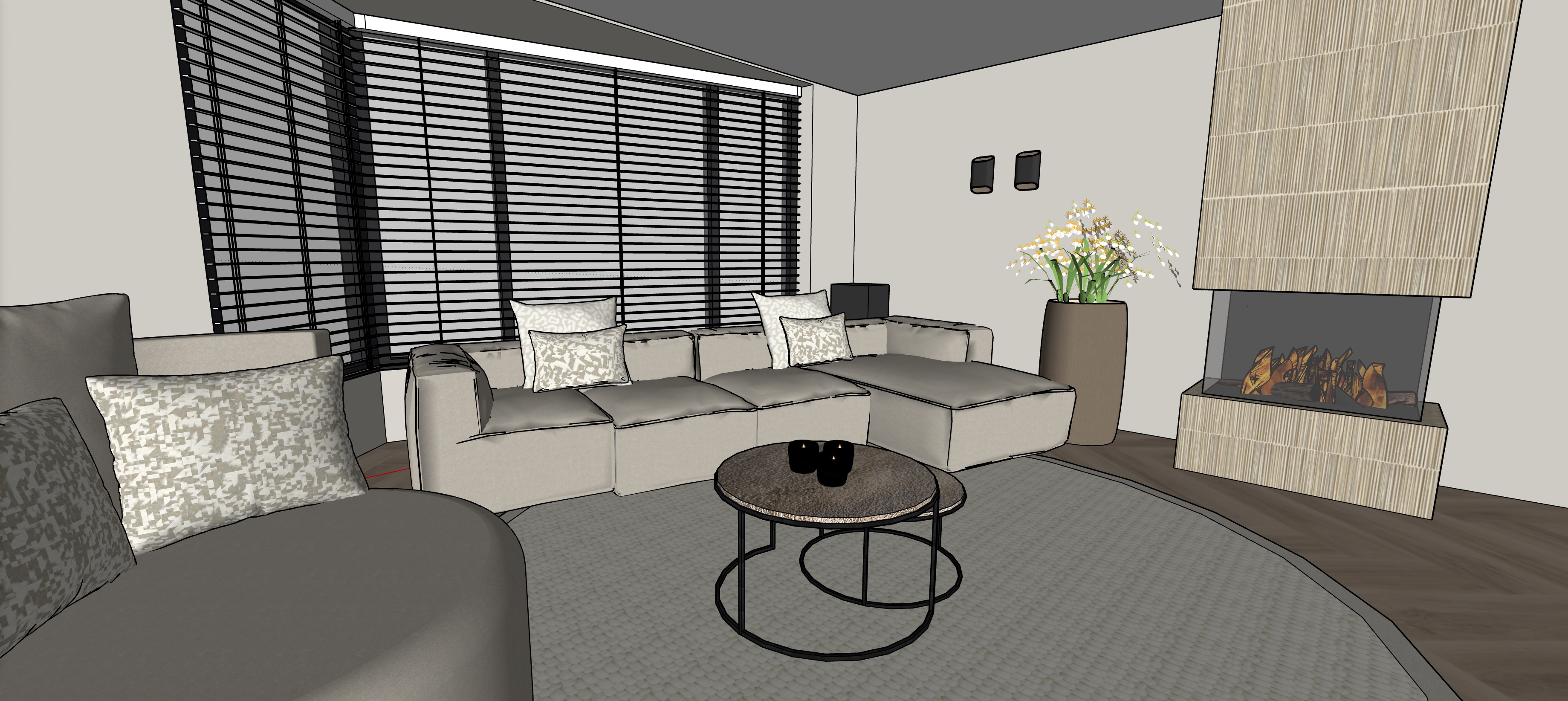 can you make this photorealistic it is light outside but the lights are on inside please keep the materials the same and make the floor light brown
