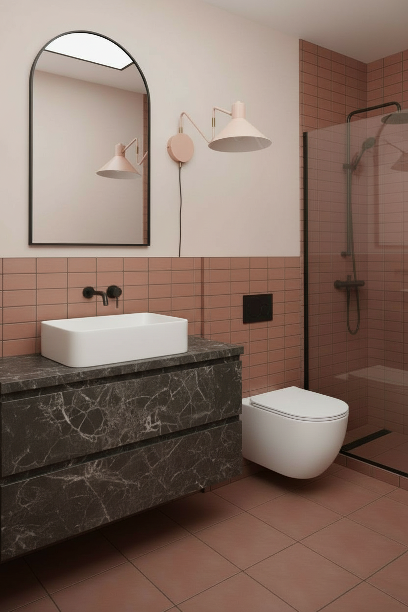 transform the provided design software drawing into a highly photorealistic kitchen rendering maintain the exact layout proportions and cabinetry locations from the original design file the kitchen features flat panel lower cabinets in a muted sophisticated green with a matte or soft satin finish upper cabinets are flat panel medium to light oak with visible natural wood grain and a warm tone the countertops and backsplash are taj mahal quartzite featuring soft beige cream and subtle veining the quartzite continues as a waterfall edge on one side of the peninsula and wraps down the back of the peninsula a custom gold metal range hood is centered above the cooktop with a refined brushed or satin finish use realistic materials accurate reflections natural wood texture and true to life stone veining lighting should be soft and natural as if daylight is entering from nearby windows with gentle ambient and task lighting to enhance realism render at high resolution with professional interior photography quality realistic shadows depth and perspective