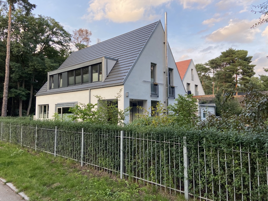exterior shot show same roof structure and white facade with white windows lusch garden with