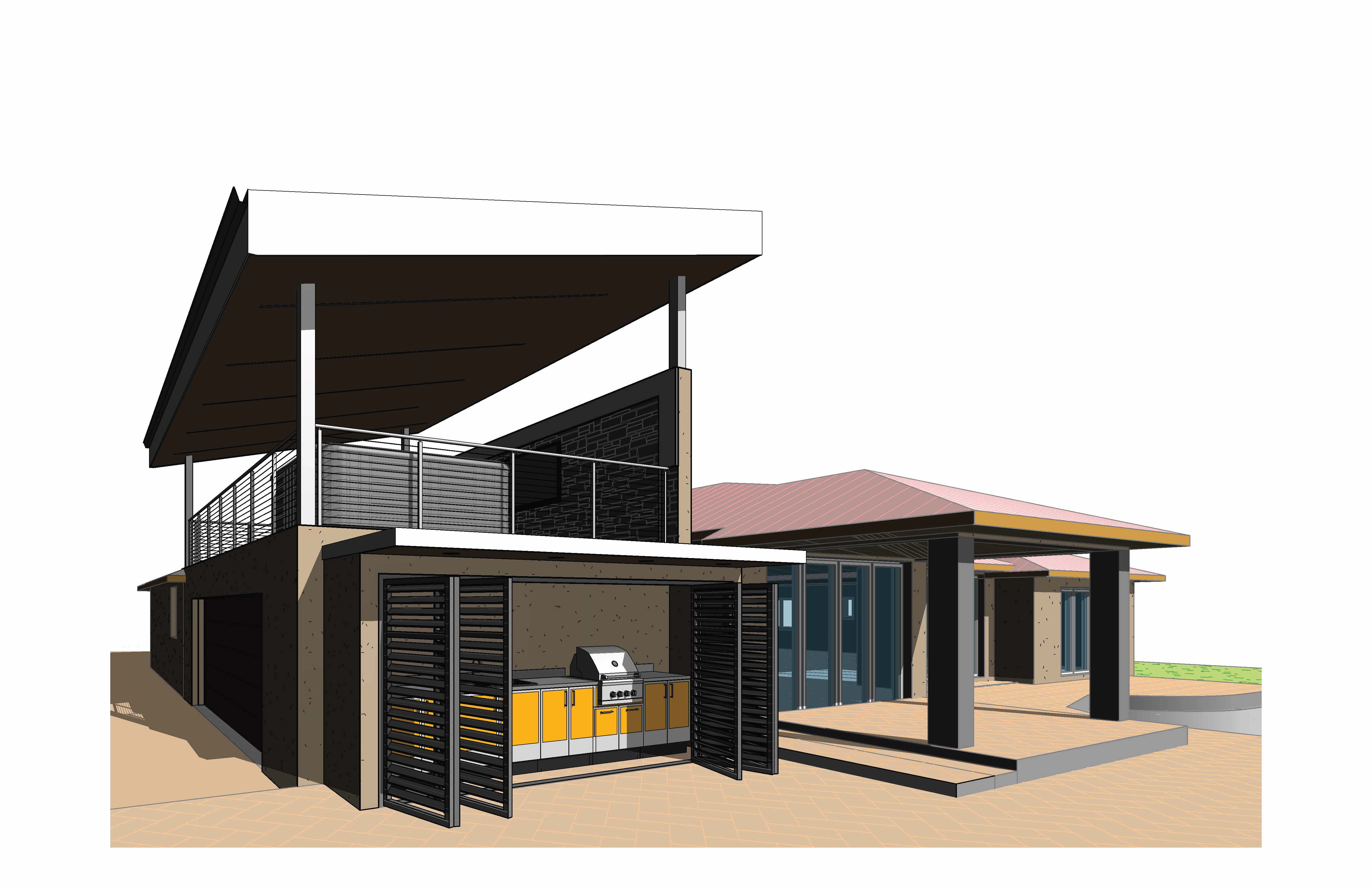 smooth white stucco building cherry wood plank ceiling with glowing linear lighting canopy has white fascia louvered wood doors in front of outdoor kitchen are also cherry wood finish columns are white to match walls add tropical trees in the background and clouds in the sky architecture