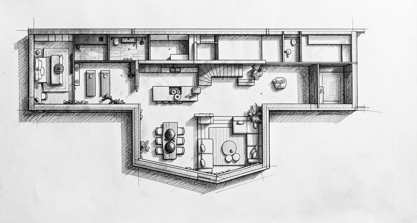 render a beautifully detailed aerial view of a vast landscape the area is intricately planned with winding paths and lush greenery use a palette of muted greens for the fields and darker shades for the dense woodland the ponds and water features should be realistic blues with reflections of the sky and buildings and a ripple in the water there are paddle boarders on the water incorporate earthy browns for pathways infuse the image with a balanced natural atmosphere capturing both tranquility and the vibrant life of a countryside the two buildings to the rear are a mix of timber cladding and small amounts of white render with large glazing reflecting the scenery to the front right of the image there are 6 padel courts with the walls made from glass various colourful planting and shrubs scatter the grass and along the paths the grass is neatly mowed
