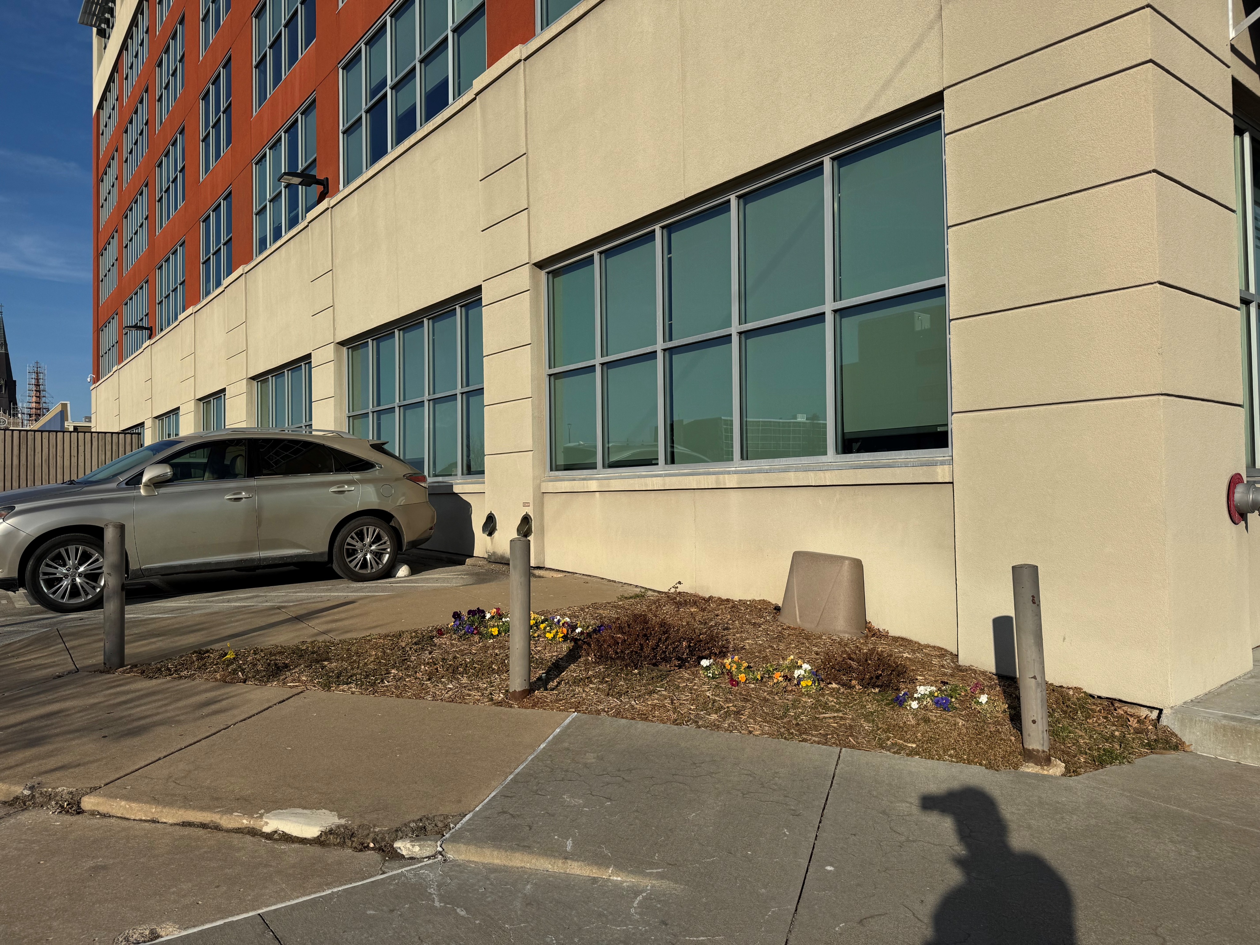 add the bike rack in the reference image to the landscape bed in the photo add concrete around the base of the bike rack and fill in the entire landscape bed with concrete
