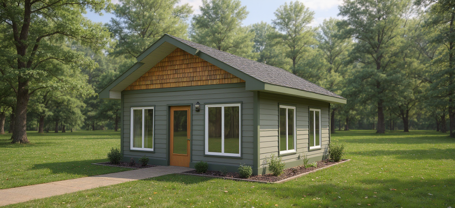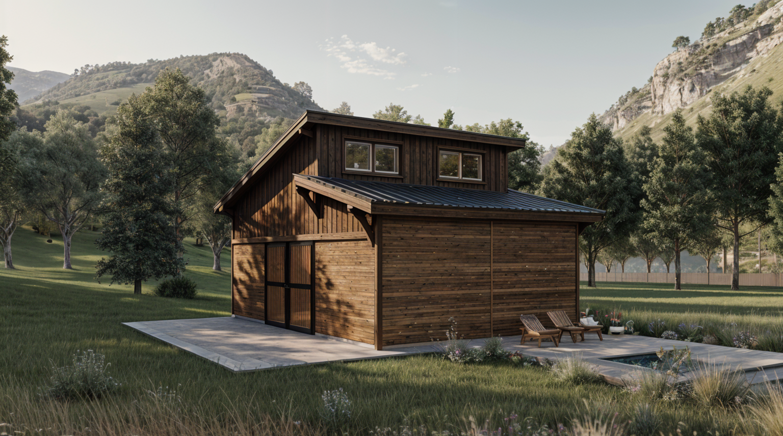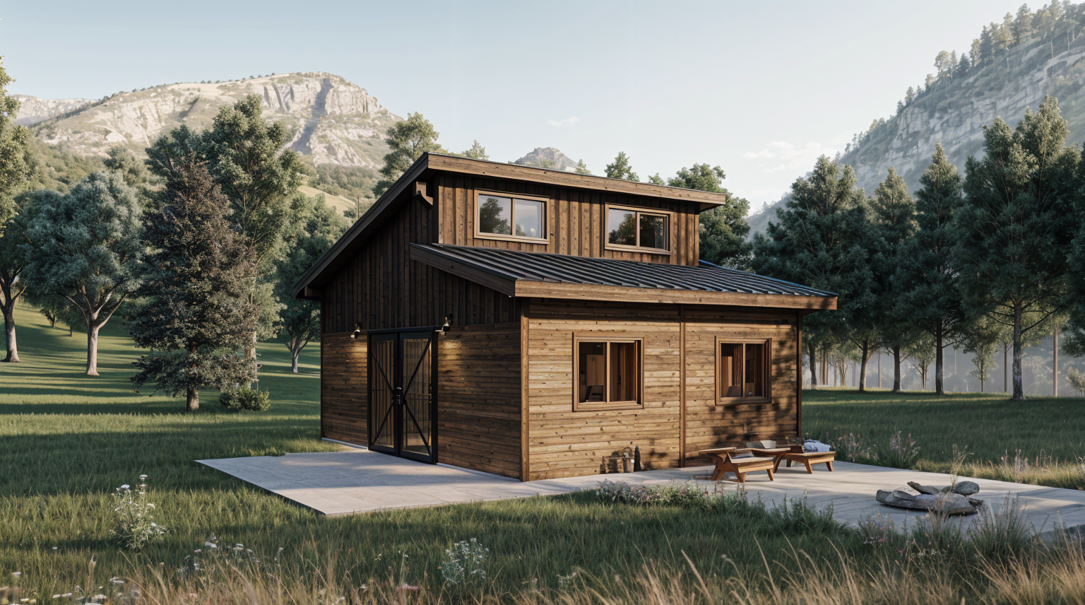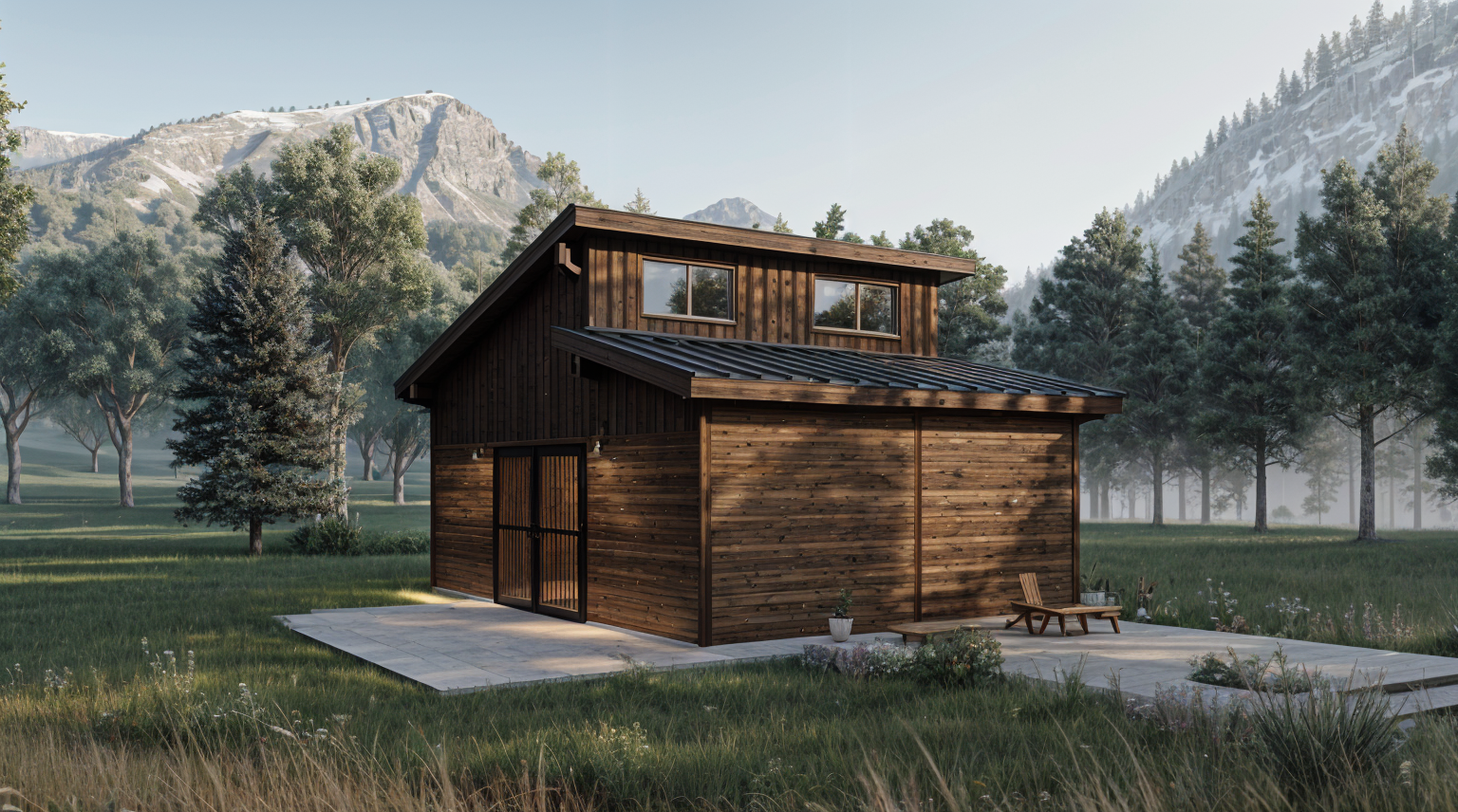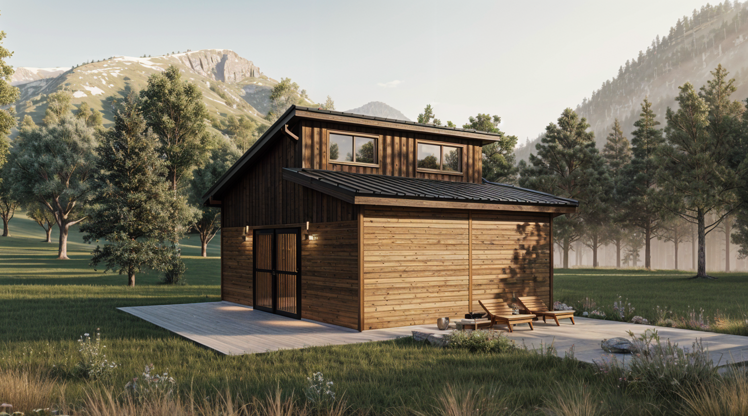 clean architectural exterior rendered in cinematic daylight lighting warm cedar siding on the bottom portion of the structure cedar wood barn doors with black trim black metal standing seam roof forrest in the background natural daylight landscape glass reflections on the windows natural wood textures high fidelity photorealistic visualization crisp shadow falloff refined fa ade geometry richly detailed grain patterns soft atmospheric depth calm minimal landscaping premium architectural photography mood ultra clean composition and materials