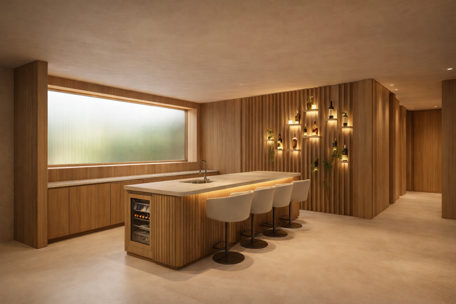 interior entry bar design modern organic brentwood style maintain overall layout with long horizontal window on left wall above pony wall and bottle display feature wall on right adjust island to connect and terminate into the right feature wall no gap creating a built in anchored composition updated design direction island redesigned to integrate seamlessly into the right wall touching and blending into the vertical wood feature system island form becomes more architectural and monolithic with softer sculpted geometry rather than a standalone object finish to match feature wall rich walnut with vertical fluting fins language wrapping the island base where applicable countertop in taj mahal quartzite with soft eased edges maintaining a warm natural tone no appliances in island remove beverage fridge completely maintain bar seating on outer side clean and minimal feature wall reference driven match previous reference image vertical walnut fins with integrated recessed niches bottles displayed within carved niches each softly backlit with warm integrated lighting composition feels rhythmic sculptural and high end like a gallery wall back counter under window full walnut cabinetry with integrated paneling taj mahal slab countertop with fully integrated sink seamless carved basin same material minimal faucet clean and flush detailing window remains frosted reeded with soft daylight and concealed led glow at base materials palette walnut wood throughout warm rich tone taj mahal stone soft cream beige with subtle veining neutral light stone concrete flooring lighting warm 2700k lighting throughout hidden led accents under island inside niches and at window base soft spot lighting to enhance texture of wood fins style high end residential bar organic modern warm minimalism sculptural cohesive and integrated camera eye level from entry wide angle realistic rendering soft shadows high detail architectural visualization