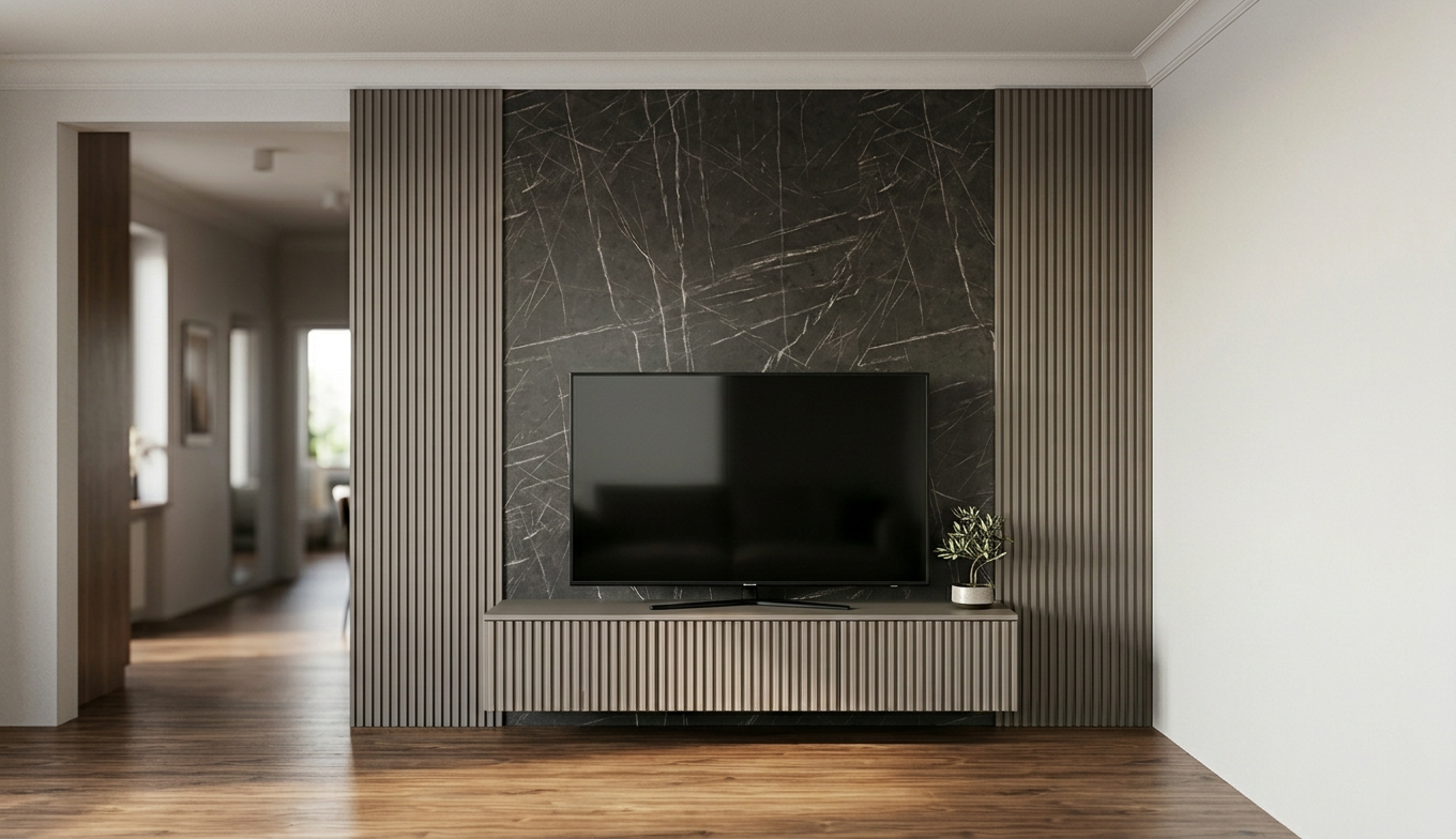 szafka i panele po bokach s w kolorze ncs 5502 y i s ryflowane kamie pomi dzy to kolecja internity p ytka wielkoformatowa magnum ih selection a902367 antracytowy szafka ma blat w kolorze ncs 5502 y szafki wisz nad pod og 100mm a ryflowania s w tej samej p aszczy nie co kamie na cianie i na rtv postaw telewizor p aski samsung 65 cali bez adnych led w p yty ryflowane maj 18mm grubo ci tyle samo co kamie z lewej strony ko czy si panel i dalej jest hol wi c skasuj cian z prawej strony jest bia a g adka ciana ca a szeroko tej ciany to 265 cm popraw skal tv ma 146cm kamie 160cm a panele po bokach po 52 cm zr b szerszy tv tak eby by kr tszy z prawej i lewej po 7cm od panela z kamienia usun sztukaterie i ledy prawa strona ciana bia a i skasuj ten bia y kawa ek ciany z lewej strony lamelek
