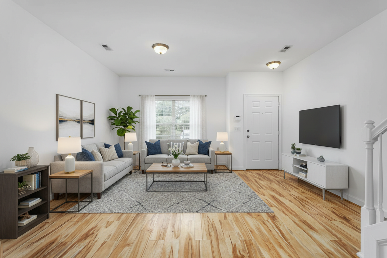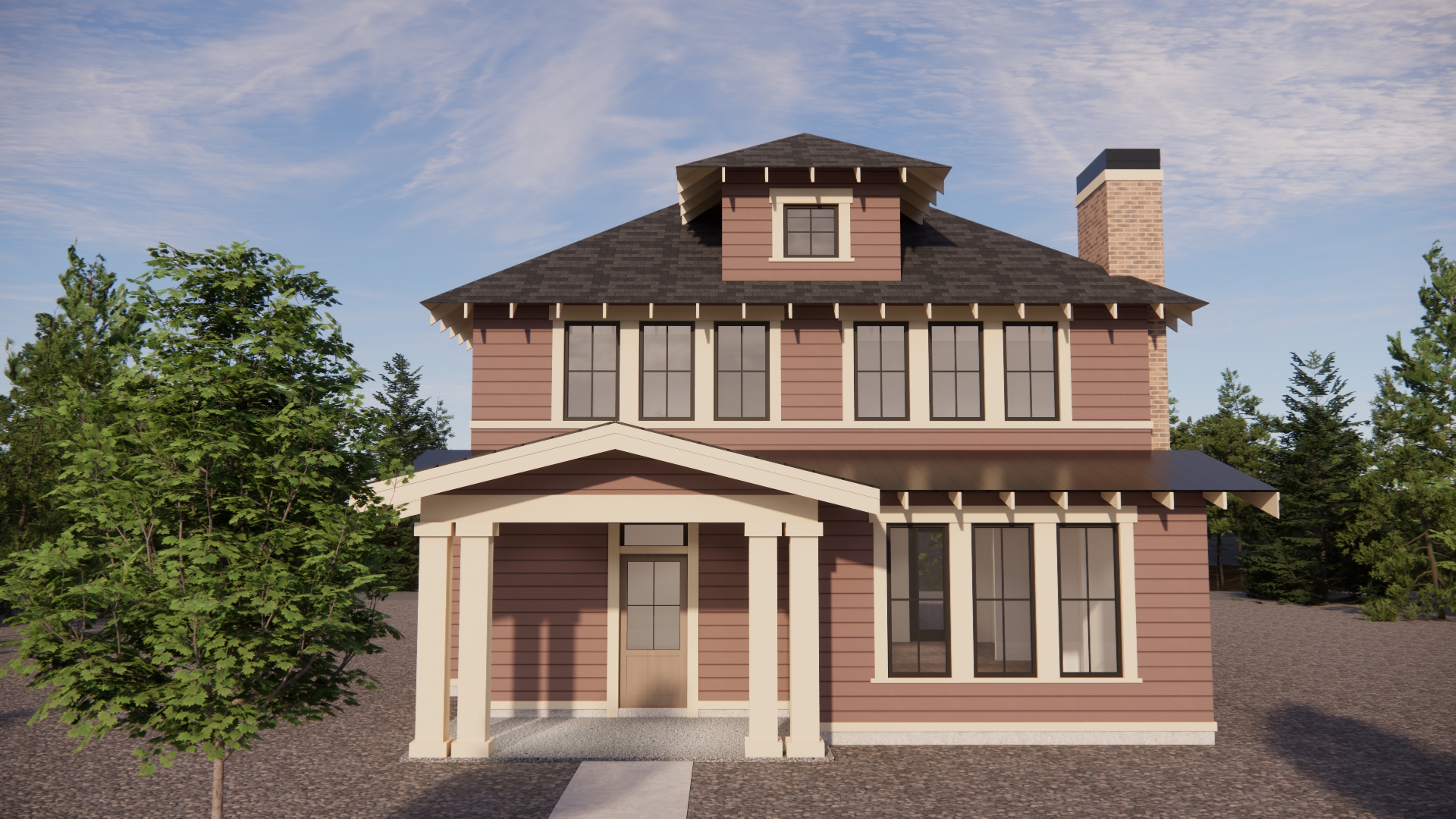 a charming two story house with siding in warm rosewood accented by cream trim and dark grey roofing the chimney is crafted in elegant red brick the scene is set in a tranquil landscape with lush green trees and a clear blue sky creating a serene and inviting atmosphere