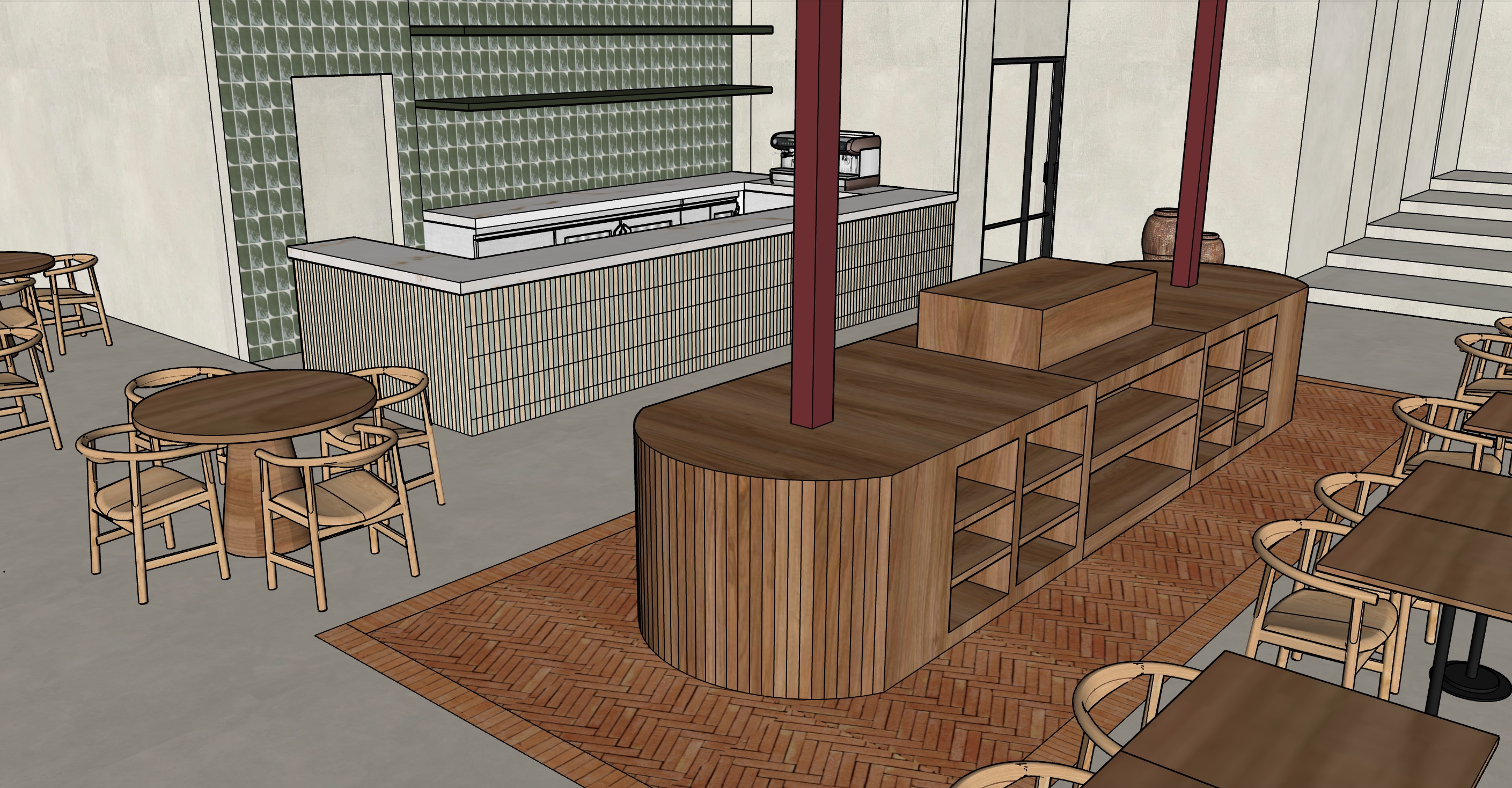 renderiza haciendolo foto realista con una luz de mediod a cuidando el acabado de los materiales la barra son azulejos verdes y beige formato rectangulares y la pared de la trasera son azulejos vitrificados la estructura central es madera a ade elementos de buffet ya que es una mesa de buffet fruta dulces leche zumos y a ade decoraci n estilo wabisabi el suelo tiene una zona con adoquines y el resto es microccemento