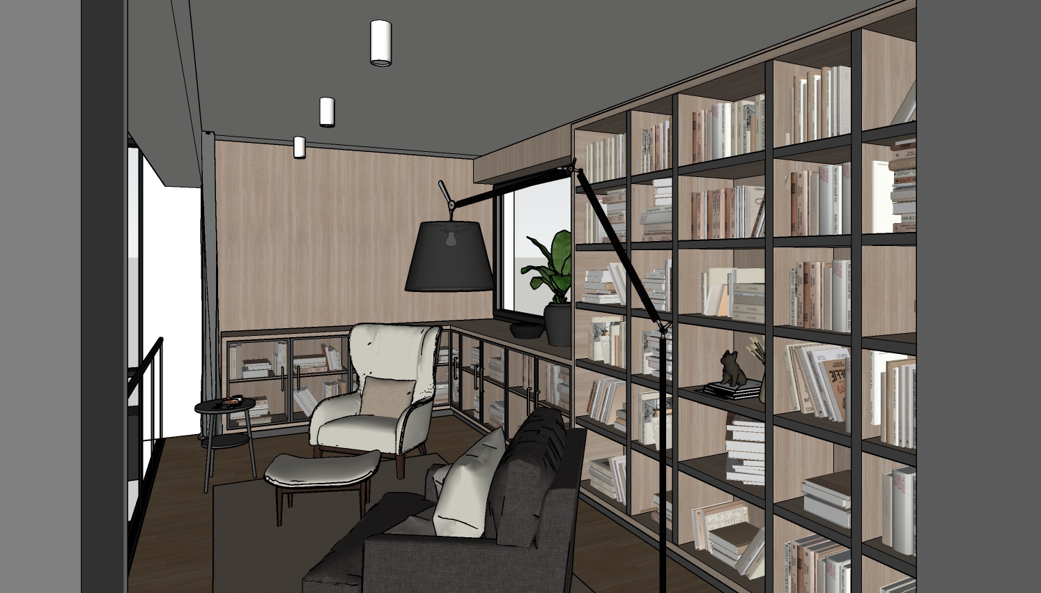 exterior shot modern library on mezzanine with glass balustrade incorporate soft beige grey and cream tones for the chairs to create a cozy atmosphere use light wood for flooring aim for a stylish and inviting atmosphere