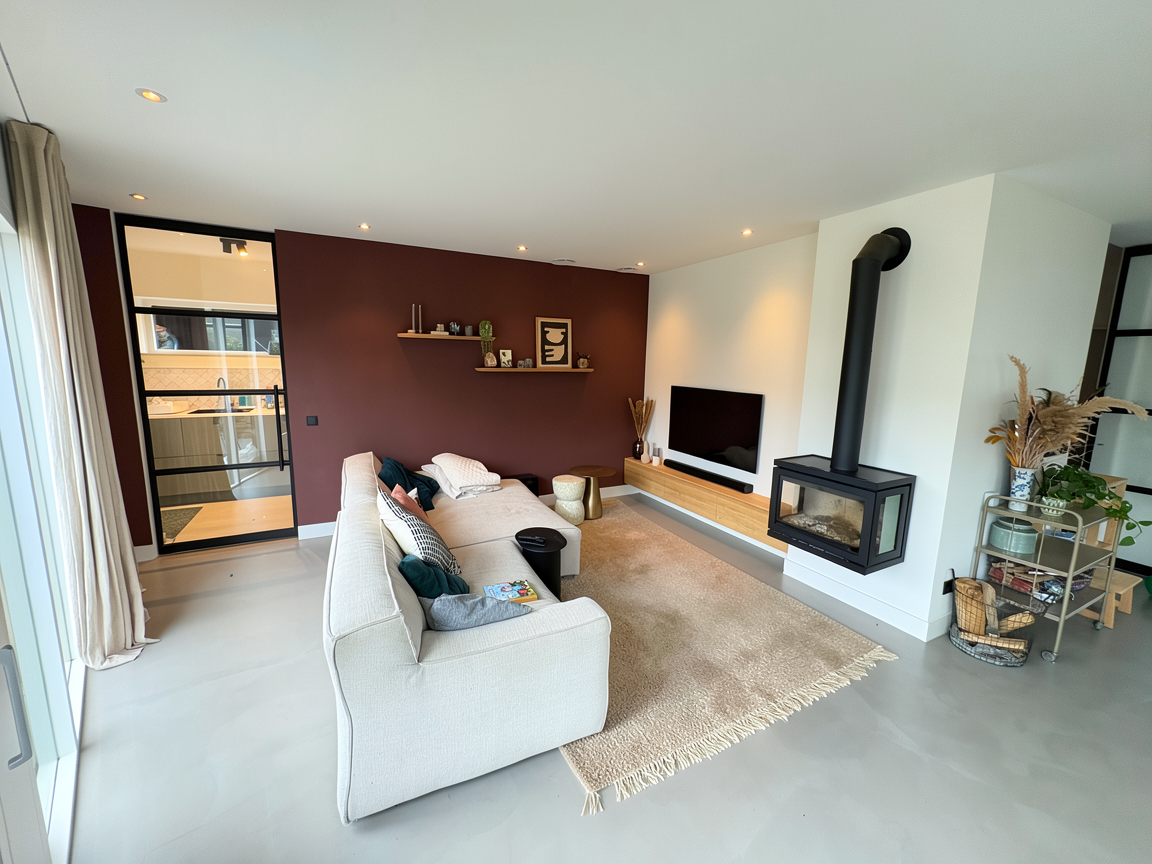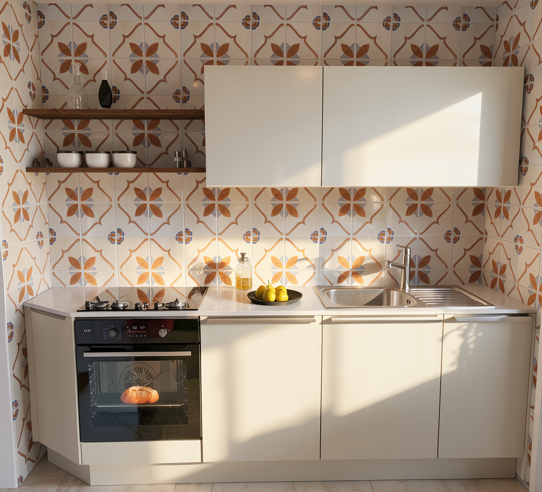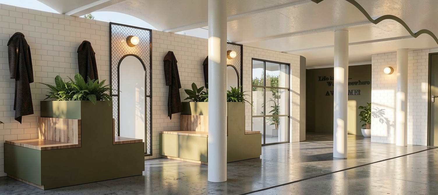 render this window seating without changing the design add a realistic 1st floor trees background on the window wall color a bit beige and skirting white make the bench material realistic change the material finish into white oak for the base and grey fabric for the cushion add pillow cushions remove led strip make the lighting a bit dim don t change the color of the socket still use black dark grey make the lower part realistic add accessories this is a buddhist prayer room do not add more socket other than the original image add a dim led strip inside the lower shelf not the top part