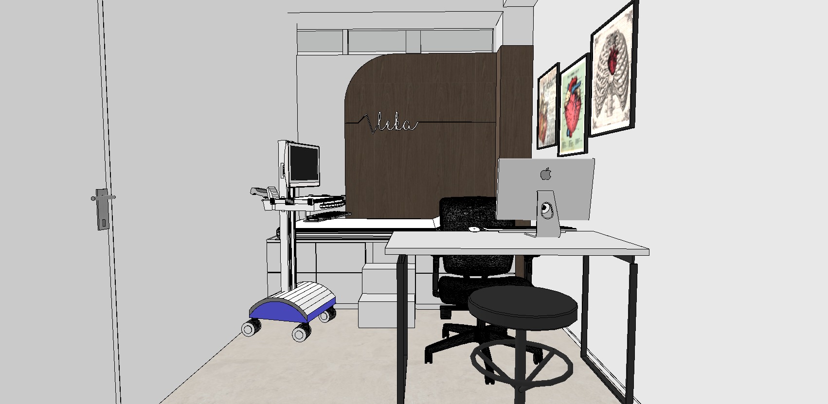 this is the cardiology office room the render should look as realistic and high quality as possible the ambient light should not be warm but brighter the wood texture should look as realistic as possible and behind the wood panel place led lights also the logo on the wood should look as clear as possible it is also done with led lights on the left side is the ultrasound for heartbeats and it should look as realistic as possible on the work table place minimal sparse decorations while on the right side on the floor place led lights so don t change anything just the render should look as realistic and high quality as possible the floor is light cream colored epoxy