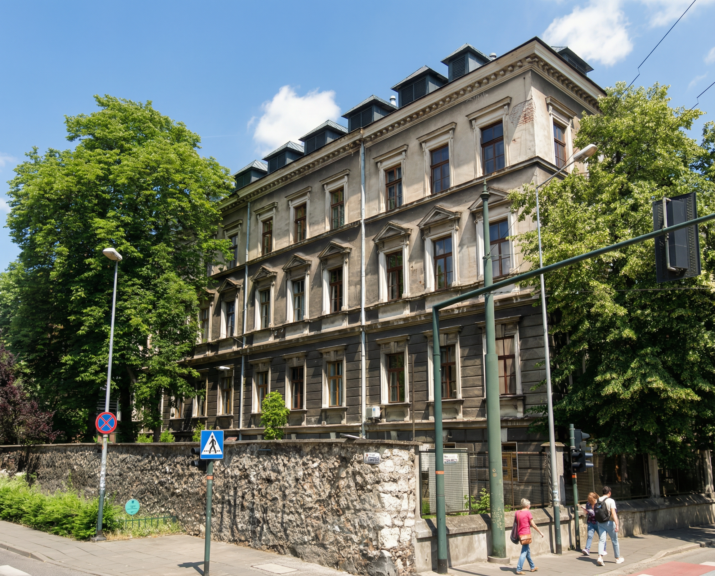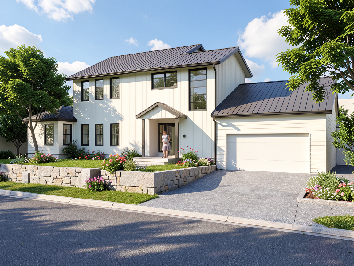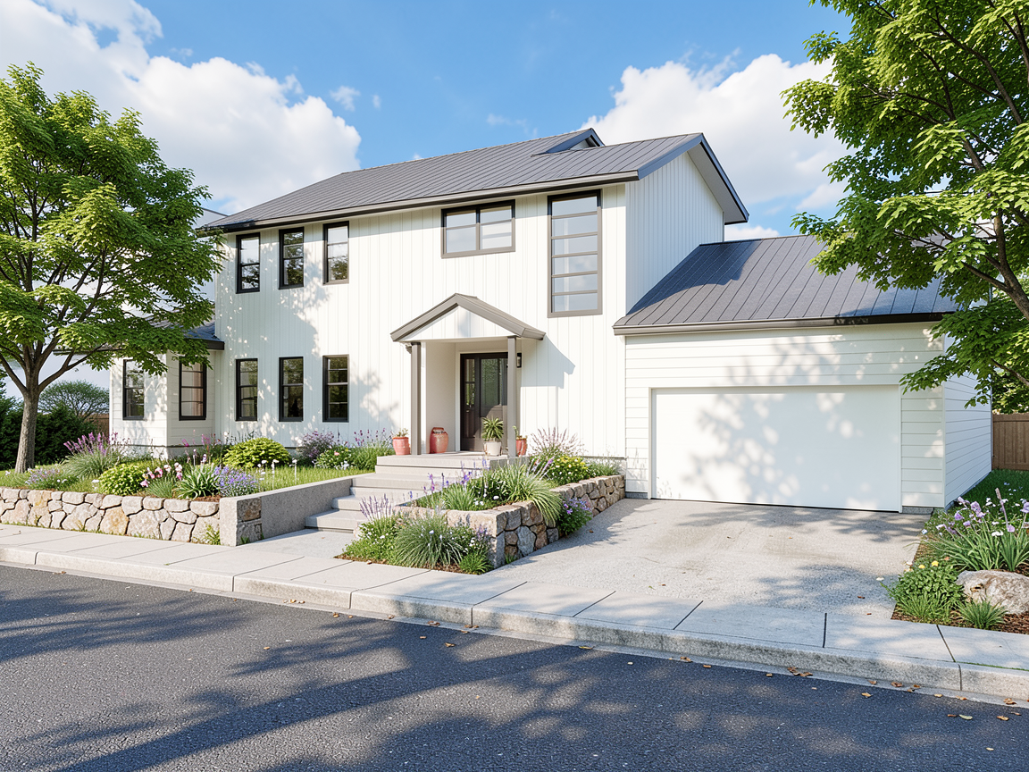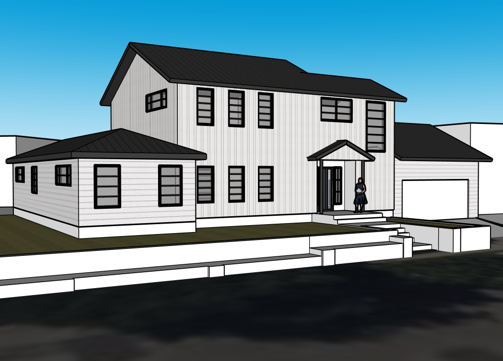 sunny day with a few clouds this view is looking northwest add trees to the sides but don t block the house too much add flowers and grass near the house there is a sidewalk and street in front of the house connect the driveway in front of the garage to the street there is a retaining wall to the southern part of the yard the path from the front door should connect via concrete stairs to the sidewalk