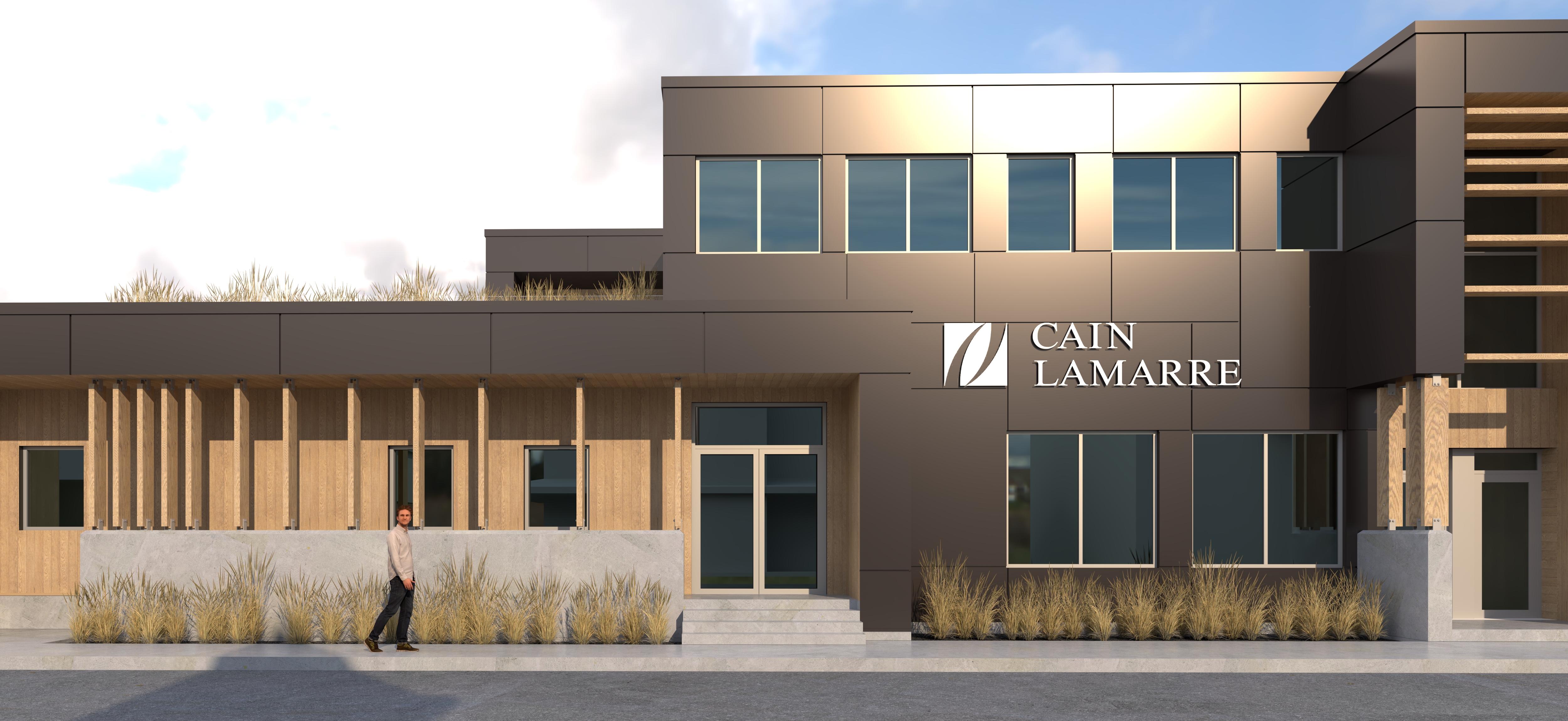 ultra photorealistic architectural rendering of a contemporary commercial building with dark metal panels natural vertical wood siding and concrete base add realistic material imperfections subtle roughness variation micro scratches edge wear and light dirt accumulation especially at base of walls and panel joints improve wood realism with natural color variation between boards deeper grain texture and soft ambient occlusion between slats enhance concrete with pores slight discoloration and subtle weathering make asphalt highly realistic with fine aggregate texture tonal variation and slight tire marks improve glazing with realistic reflections slight interior visibility and subtle imperfections upgrade landscaping with natural variation in grass color density and height more randomness and organic distribution use soft late afternoon sunlight with realistic global illumination subtle warm bounce light and slightly softer shadows add slight atmospheric haze for depth apply professional photography camera settings subtle depth of field slight vignette very subtle chromatic aberration and natural exposure keep composition clean realistic and cinematic
