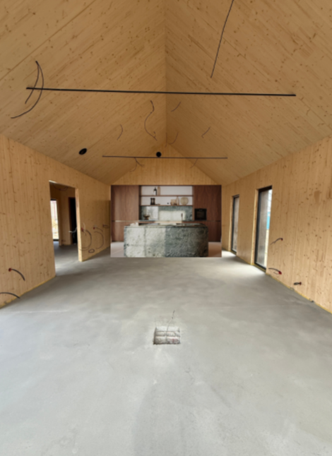 add in the foreground cornersofa tablce and chair in modern minimalistic style