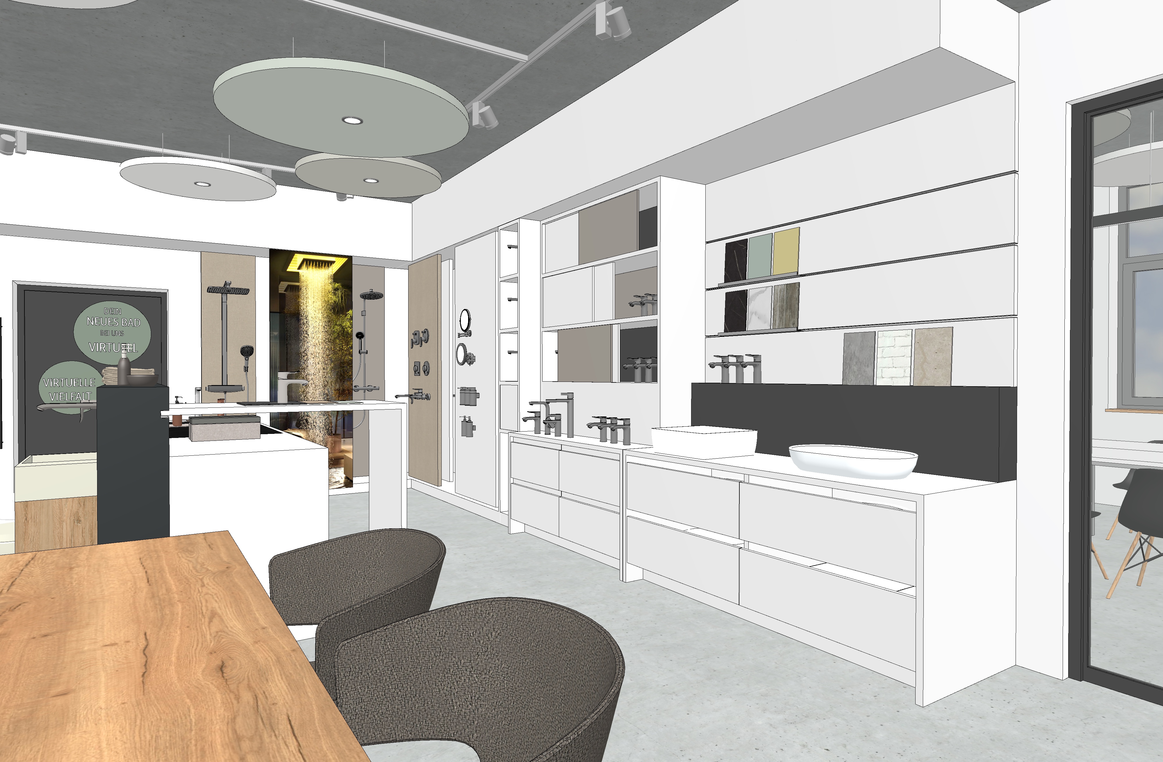 use the provided cad perspective strictly as the sole geometric and compositional reference preserve all elements exactly as given including proportions layout camera position field of view and object placement do not add remove reinterpret or redesign any architectural or interior elements no new objects furniture or light sources may be introduced under any circumstances all visible text within the image must be preserved exactly as shown do not alter reinterpret stylize translate or replace any text typography spelling layout and positioning must remain 100 identical to the original enhance the image exclusively through photorealistic rendering quality apply realistic materiality to all surfaces based on their implied function and construction maintaining the original design intent surfaces should exhibit subtle physical properties such as texture depth light absorption soft reflections and where appropriate controlled specular highlights or mirror effects avoid exaggerated or stylized materials aim for believable natural realism lighting introduce natural daylight entering the space in a plausible and context appropriate way the daylight should appear realistic and balanced without being limited to overcast conditions detect and utilize all light fixtures that are present in the original cad image these must visibly emit light and contribute to the overall illumination of the scene artificial lighting should produce realistic light falloff gentle highlights and nuanced shadow transitions do not add or invent any additional light sources beyond those already visible in the image the final image should read as a faithful photorealistic translation of the original cad perspective not as a reinterpretation