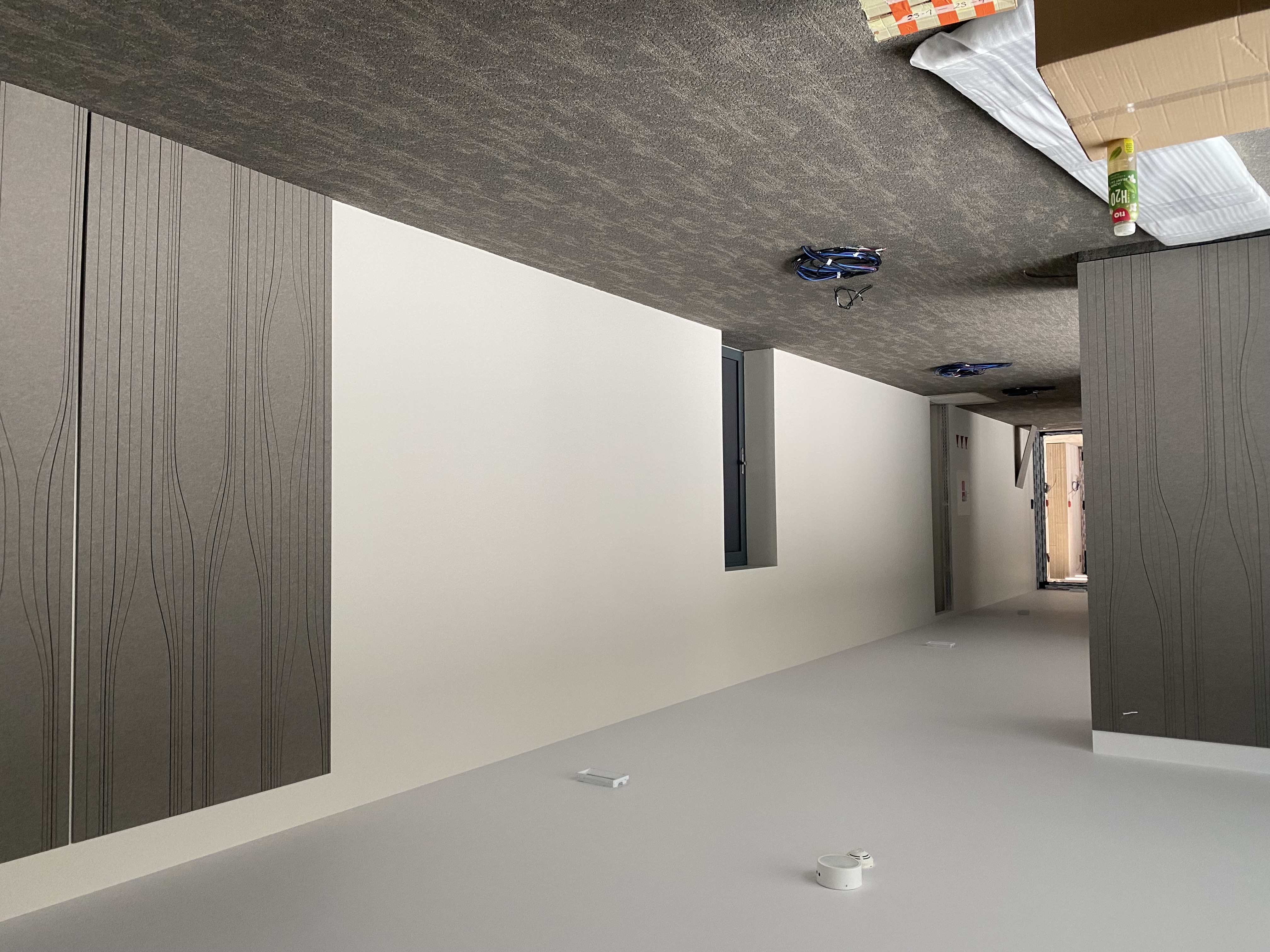 extend the vertical wooden slat wall panels on the right side across the entire length of the wall until the end the slats should be continuous with no gaps between panels forming a seamless uniform raster pattern maintain consistent spacing alignment and natural wood texture ensure the design looks cohesive minimal and architecturally clean matching the existing style and lighting conditions of the space