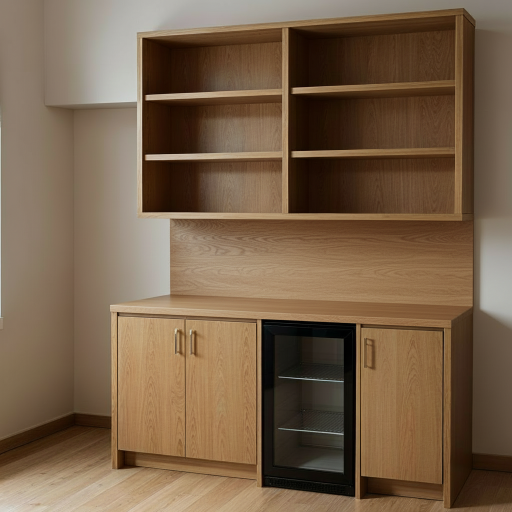 add flat grey door on the left side of the unit add water in the fridge and put white taweles on upper shelves