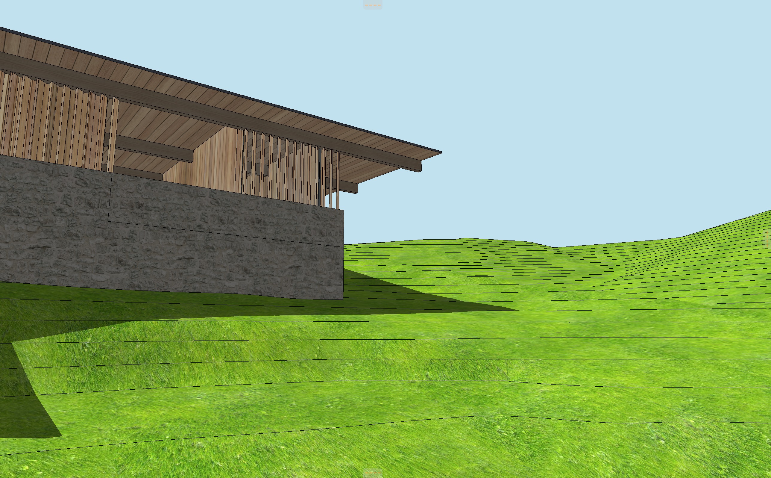 night time scene interior to be lit up with light spilling through louvers landscape hillside with sagebrush and tall wild grasses brown drystack stone walls corten standing seam metal roof
