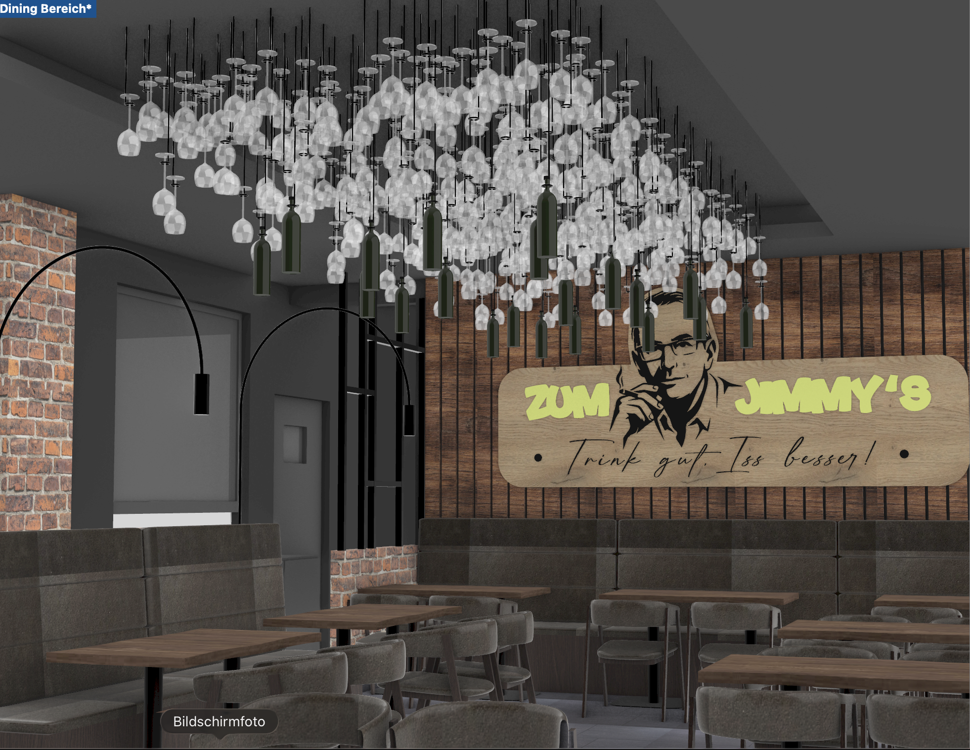 prompt transform this interior render into an ultra photorealistic high end restaurant interior photograph while strictly preserving the exact original geometry camera angle composition layout proportions furniture shapes ceiling structure wall design and all architectural elements important do not redesign replace remove restyle resize or reinterpret any furniture objects decorations lighting elements or architectural features keep all chairs benches tables pendant lamps wine glasses wine bottles wall paneling logo sign ceiling details and room layout exactly as shown this is not a redesign it is only a material lighting texture and realism enhancement materials furniture the chairs and bench seating should remain exactly the same design and shape but be rendered in high quality realistic leather upholstery in the same color tone as shown in the image the tables should be rendered in realistic walnut wood with subtle natural grain elegant matte finish and authentic wood texture the slatted wall in the background should also be rendered in rich walnut wood with warm refined realistic texture and depth the logo sign zum jimmy s mounted on the back wall should remain exactly the same shape size and placement but be rendered as a real oak wood panel with realistic oak grain and natural light wood character lighting add a soft indirect backlight around the oak logo panel in 3000k warm white so the oak sign subtly glows from behind and stands out elegantly from the walnut slatted wall the black painted dropped ceiling perimeter visible in the upper area must remain exactly as shown and should include continuous indirect perimeter lighting in 3000k warm white the edges and shadow gaps of the dropped ceiling should be clearly visible and realistically illuminated just as in premium hospitality interior photography keep the atmosphere warm moody elegant inviting and upscale like a professionally photographed modern rustic restaurant special ceiling installation in the central non dropped ceiling area keep the hanging wine glasses and wine bottles exactly as shown these wine glasses and wine bottles should be visibly suspended from a black ceiling grid using thin black cords black suspension wires this hanging installation is a key signature design element of the room so it must remain visually important and highly realistic the glasses should have realistic transparent reflections refractions and subtle imperfections like real glass the wine bottles should have realistic dark green glass material natural highlights and believable weight fairy light integration integrate a warm delicate fairy light string into the same black ceiling grid where the wine glasses and wine bottles are mounted the fairy lights should be woven naturally through the grid not hanging randomly the fairy lights should emit a soft warm 3000k glow their reflections should create a sparkling glittering effect in the hanging wine glasses and wine bottles this sparkle effect should feel subtle elegant atmospheric and premium not kitschy or overly bright photorealism goals make all materials look fully realistic leather walnut wood oak wood black painted metal glass fabric brick and matte painted surfaces improve the image with realistic interior lighting natural shadow depth physically accurate reflections believable glass highlights realistic material imperfections soft ambient bounce light premium hospitality photography mood the final image should look like a real professionally photographed restaurant interior not a 3d visualization negative instructions do not change the furniture design do not change the chair shapes do not change the benches do not change the table shapes or positions do not remove or add new furniture do not alter the wall design do not redesign the logo do not change the ceiling layout do not remove the hanging wine glasses or bottles do not simplify the installation do not change the camera perspective do not create a new concept do not stylize do not make it look cgi no geometry changes no furniture replacements no composition changes target style ultra photorealistic restaurant interior photography warm luxury hospitality design modern rustic elegance cinematic but natural lighting realistic material depth premium commercial interior photo