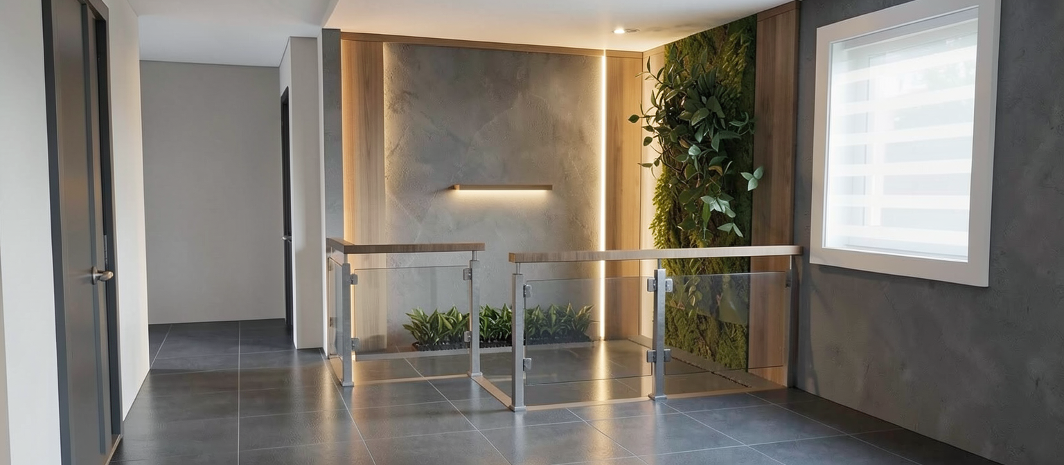 keep geometry and color ajoute bande led sur le cot du panneau de bois situ sur le mur de beton gris ne pas mettre d clairage sous la tablette et foncir le mur de b ton