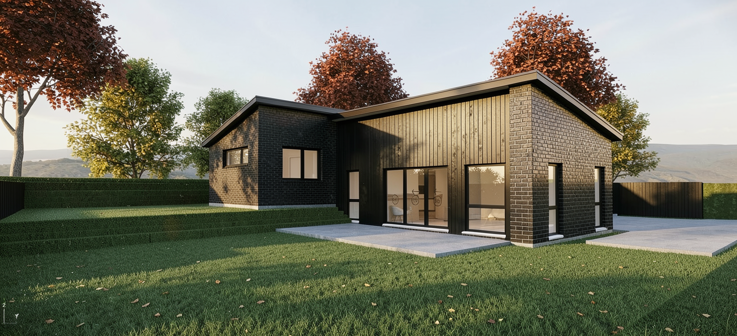 photorealistic architectural rendering of the front elevation of a mid century modern home inspired by the organic architectural philosophy of frank lloyd wright maintain the exact camera angle material distribution and building volumes as shown in the original model no alterations to proportions or composition exterior materials remain exactly as designed muted natural wood siding and warm earthy brick strong horizontal rooflines deep overhangs and clean geometric forms emphasize harmony with the landscape the setting includes mature oak trees forming a natural forest backdrop and additional oak trees framing the right side of the property the home feels integrated into the land rather than placed upon it the front grounds are lush and welcoming dense healthy green grass layered native plantings ornamental grasses and low shrubs arranged in a natural yet intentional composition landscaping feels organic and timeless lighting is soft warm and balanced gentle late afternoon glow with diffused sunlight no harsh highlights or blown out areas light enhances material textures and creates soft linear shadows beneath overhangs subtle architectural lighting integrated under roof overhangs and near the entry warm and understated interior lighting glows softly through glazing inviting but not overpowering atmosphere serene grounded inspiring and welcoming emphasis on horizontality integration with nature natural textures controlled dynamic range soft contrast architectural photography style high resolution timeless organic modernism