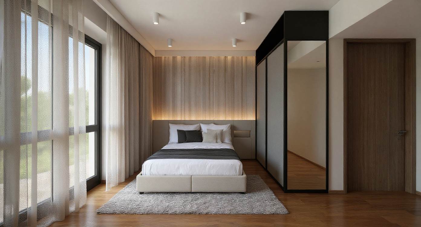 a modern luxurious restaurant with a serene and sophisticated atmosphere the room features sleek grey oak cabinetry with flutted travertine curved cabinets and a large island centerpiece made natural traavertine romano the walls are clad in a soft cashmere hue with panelling complementing the cabinetry appliances are seamlessly integrated adding a touch of contrast overhead lighting is warm and ambient creating a cozy yet refined ambiance the flooring is parquet enhancing the airy feel of the space sparse greenery adds a hint of freshness while maintaining the minimalistic and clean design outdoor light from the right hand side window view is of luxury villa style