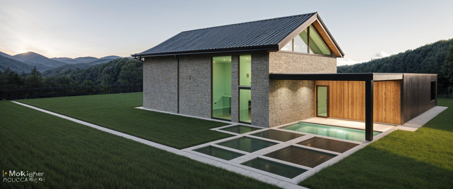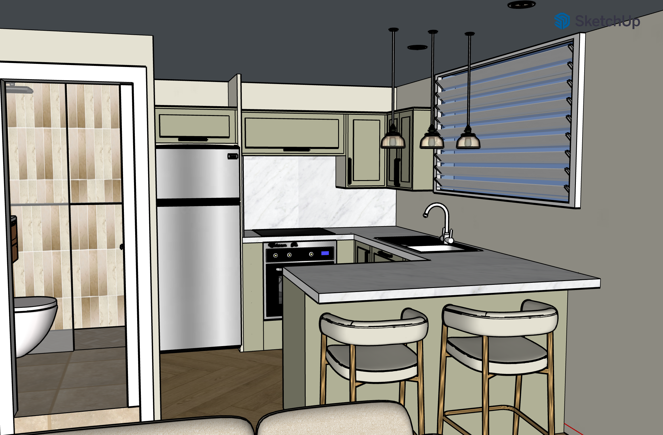 interior shot sage green kitchen cabinets with black handles marble splashback and marble worktop cream high chairs with gold legs woodern herringbone floor bathroom with zelige style tiles on the left