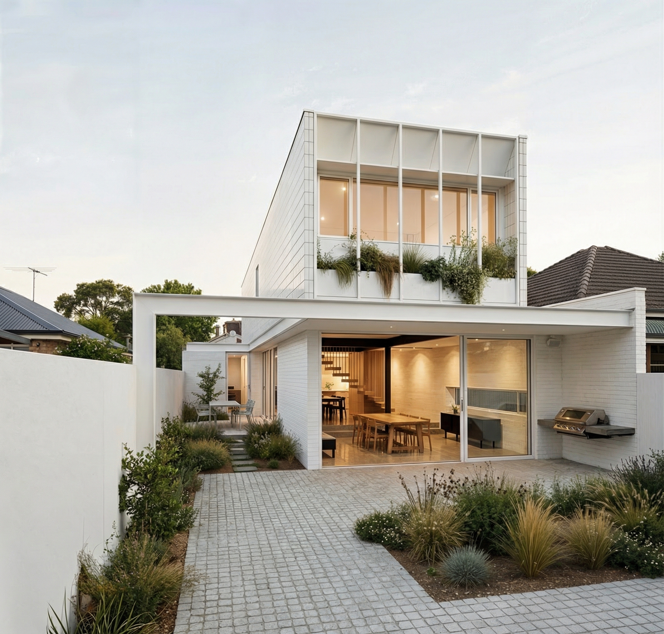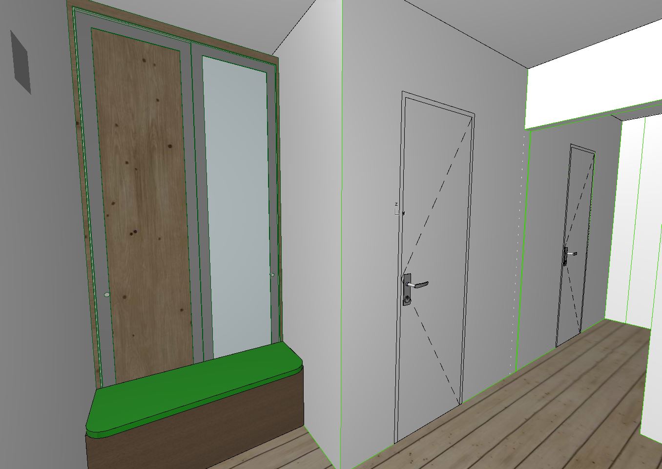 a modern interior design hallway a small bench on the left 45 cm in height with a turquoise padding velvet textile cushion all furniture has sharp details the bench is in front of a floor to ceiling 2 door closet with natural wood texture with a mirror on one of the doors the walls to the right are plated with the same natural wood texture material as the closet and have sharp details the 2 doors on the right wall are built in filo muro doors from the same natural wood texture the floor is hardwood floor natural finish there are 2 suspended ceiling lamps that have warm light and cast soft shadows