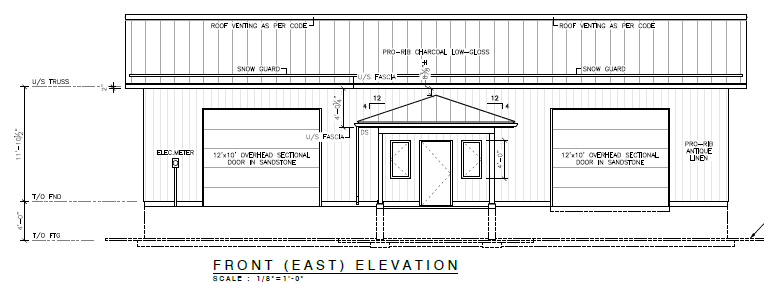 place on treed lot with driveway aprons up to the overhead doors use grey metal roof and blue siding with white trim