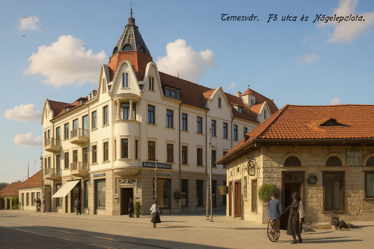 black tram sunny day beautyful clouds stucco fassade white people in 1900 s fashion style ground floor fassade with stone