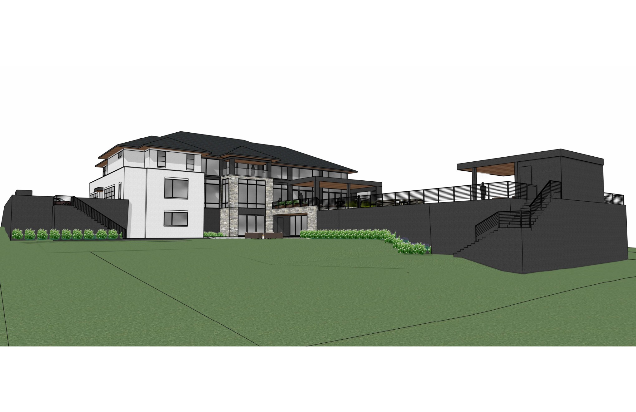 match exact color and material from reference create realistic materials landscaping and vegetation place house in semi suburban area with lots of land around it and slight vegetation in the background throughout the landscape