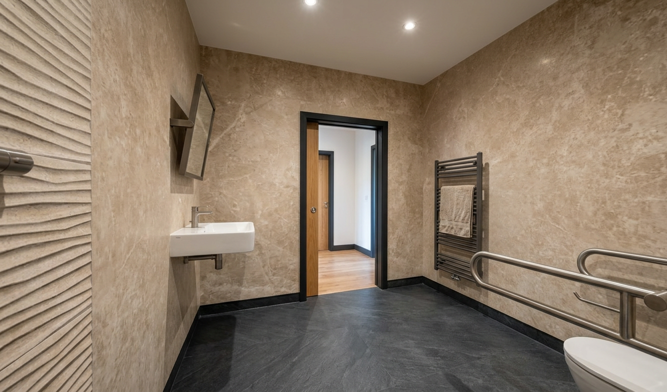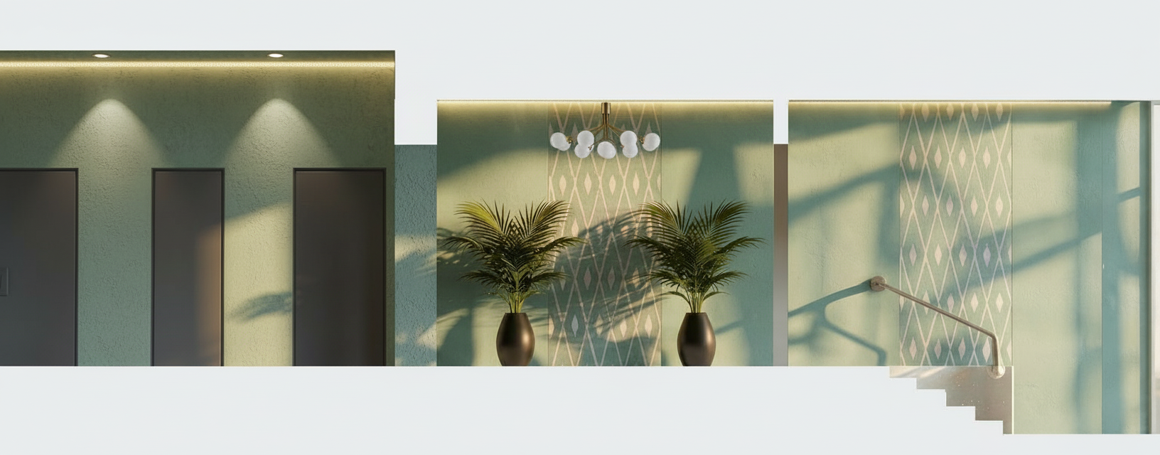 enhance this restaurant interior render without changing any geometry proportions panel layout niches doors furniture kitchen cabinets island columns or flooring do not add any spotlights or visible light fixtures preserve all original colors materials and textures exactly as they appear in the base image including walls panels mirrors tables chairs upholstery light blue kitchen cabinets green black walls fluted columns island tiles black cheddar beige doors floors and wallpaper lock all geometry including the ceiling but paint the ceiling beige to match previous interior views materials textures refine walls panels mirrors marble tables wooden chairs mosaic floors kitchen cabinets columns and island for subtle realism and texture enhancement beige and orange 3d printed panels maintain precise stereotomy subtle matte finish fine layering and alignment black mirrors and marble surfaces soft realistic reflections without changing color or intensity wooden chairs correct grain orientation natural subtle variation columns and island tiles refine surface texture while maintaining original three color pattern lighting enhance existing warm led lighting along the ceiling perimeter ensuring concealed leds softly contour every element the ceiling intersects with walls panels columns niches island to emphasize depth and 3d form lighting should remain soft warm cinematic and realistic producing subtle shadows and reflections on floors tables panels and mirrors atmosphere create a cinematic elegant inviting and luxurious yet understated mood enhancing depth material realism and warmth without changing any geometry proportions layout or original colors except ceiling color instructions for reliability across multiple views apply enhancements consistently to all visible surfaces in the frame do not introduce new geometry or alter existing elements maintain precise alignment and proportion of panels furniture columns and kitchen elements ensure concealed led highlights adapt naturally to perspective and intersecting elements
