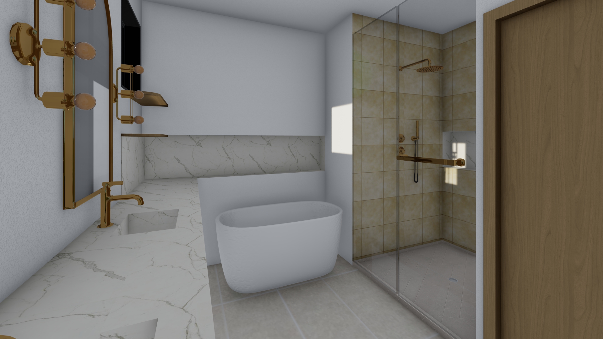 render this one add light at niche put some bottle at niche bigger tile in shower wall at can light above tub use same strategy render different angle